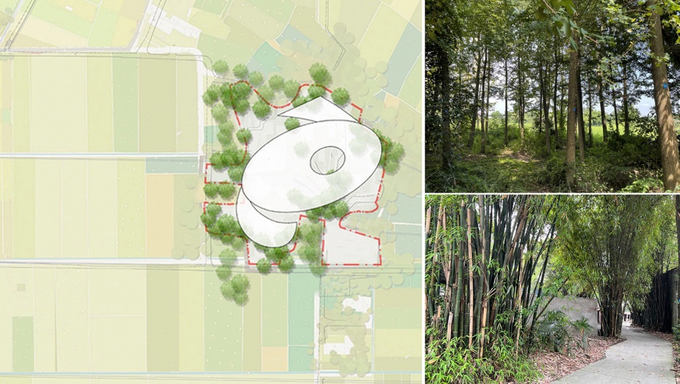 保留生态本底:基地中有大量现状树木竹林,设计之初将其中胸径大于20厘米的树木和丛生竹子标识出来,希望结合景观现状融入场地,保留场地的生态本底。建筑体量主动避让、环绕其间,形成“屋在竹中”的共生画面。