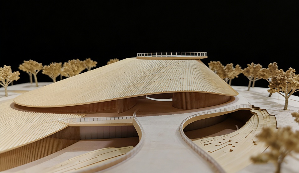 Pitched Roof Morphology: The local pitched roofs are an adaptation to the region’s hot, humid, and rainy climate. Translating this traditional DNA into a contemporary context, the design modernizes and artisticizes the classic form. Responding to the terrain that rises from north to south, the main roof takes the shape of an elliptical, bean-like curved surface. A smaller roof on the north rises from the ground to the exhibition hall, while a southern roof embeds itself into the sunken courtyard. These three planes respond to topographical changes, overlapping to express the lightness and freedom typical of Western Sichuan architecture.