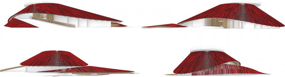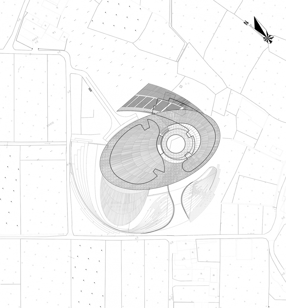 坡屋顶:这里林盘上民居的坡屋顶,多为适应常年湿热多雨的特点。针对这一传统基因的当代化转译,将传统民居的坡屋顶的经典形态当代化、艺术化。项目从自北向南逐渐抬升的田地为出发点,以一个豆瓣般的椭圆曲面作为屋面主体,北侧一片小屋面从场地上升至展厅屋顶,南侧的小屋面嵌入下沉庭院。三片屋面与地形的变化相呼应,相互交叠,尽显川西屋顶的轻盈自由。