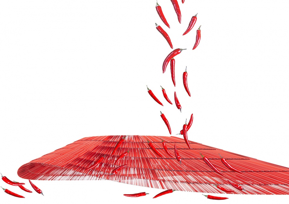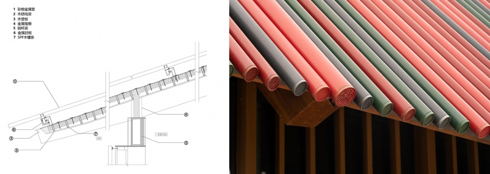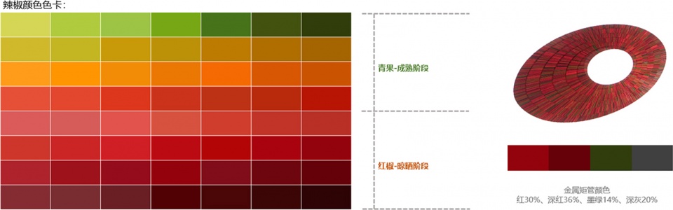 彩椒:传统屋面的小青瓦被创新性的“彩椒”元素替代。屋面装饰的“彩椒”灵感来源于辣椒从成熟到风干过程中自然呈现的色彩演变——由绿转红,再由红渐黑。历经半年的反复打样与调试,我们最终提取出四种关键色,并确定其在屋面上的构成比例:红色(30%)、深红(36%)、墨绿(14%)与深灰(20),以随机方式分布于屋面。在形态上,设计抽象自“二荆条辣椒”的截面轮廓,以直径80毫米的铝合金圆管为基础单元,其间随机穿插直径140毫米的放大圆管,以增强屋顶的视觉层次与动态变化。整个屋顶共由一万八千余根长短不一、色韵交织的“彩椒”圆管构建而成,犹如将无数辣椒轻洒于建筑之上。这一设计既延续了传统建筑的神韵,又赋予了屋顶鲜明的当代质感与审美意趣。