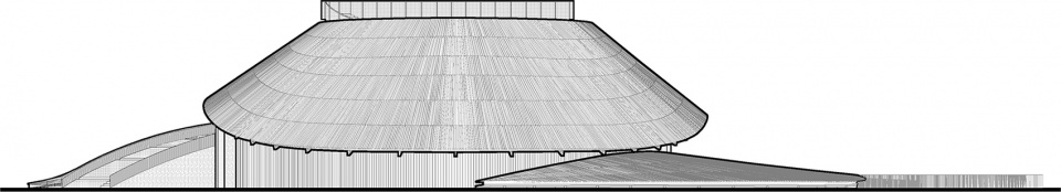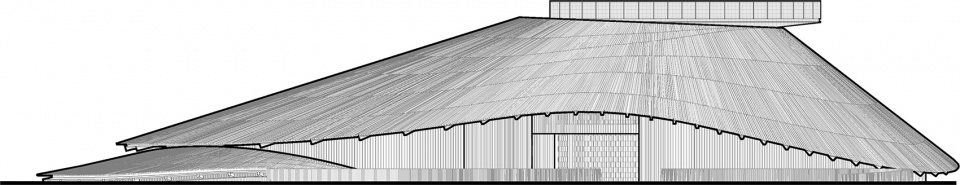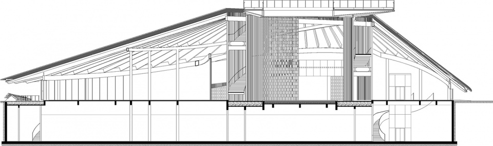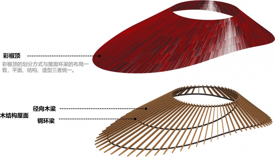 建构:传统川西建筑以穿斗式木结构屋架为主,项目胶合木梁为骨,望板和封檐板采用竹木装饰条,还原传统材料又满足当代的建构需求。结构在钢柱顶端以双曲钢环梁支撑木结构,既满足博物馆大空间的需求,又最大化利用了木梁的力学特性。钢环梁的布置不仅与建筑平面布局形成统一,以环形框架与屋面每一圈的金属彩椒划分形成深度关联:金属彩椒的划分线条沿钢环梁的曲线轨迹自然延伸,精准适配,使结构框架不再是隐藏于表皮之下的 “骨架”,而是与造型表皮相互诠释、彼此强化的整体。