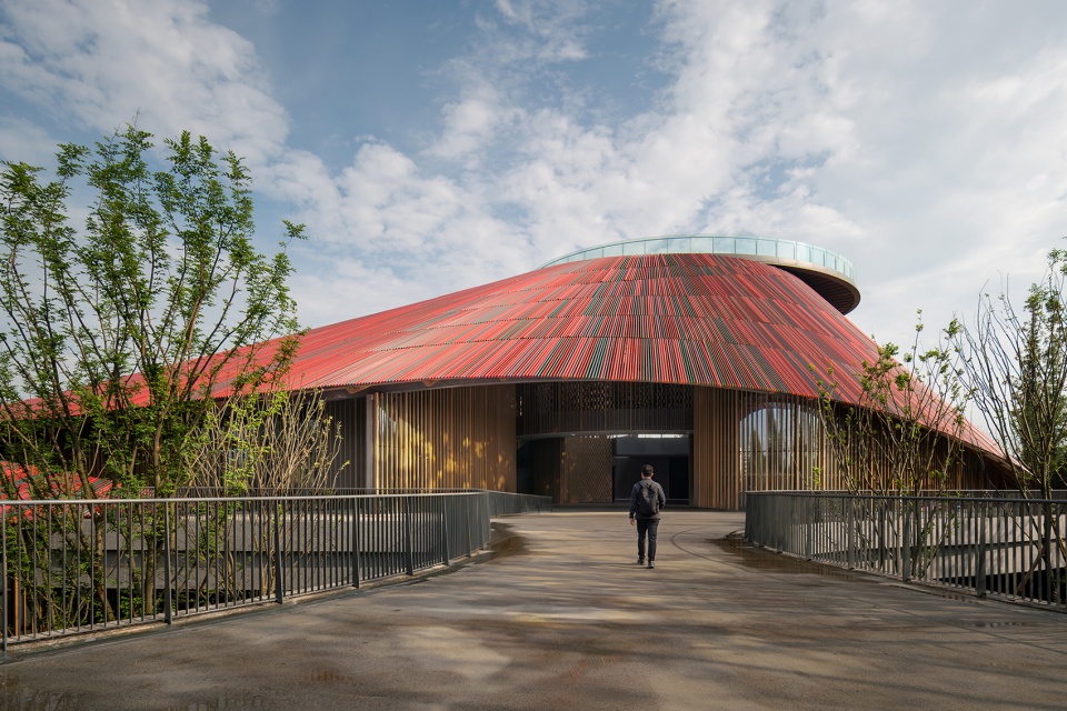 Tectonics: While traditional Western Sichuan architecture relies on the “Chuandou” (column-and-tie) timber frame, this project utilizes Glulam (glued laminated timber) beams as the primary structure. Bamboo-wood decorative strips are used for the roof sheathing and fascia, recalling traditional materials while meeting modern construction standards. Structurally, double-curved steel ring beams atop steel columns support the timber roof. This hybrid system accommodates the museum’s large-span requirements while maximizing the mechanical properties of the wood. The arrangement of the steel ring beams aligns with the floor plan and forms a deep connection with the roof’s cladding: the division lines of the metal “peppers” naturally extend along the curvature of the ring beams. This ensures the structural framework is not merely a skeleton hidden beneath the skin, but an integral part of the whole, mutually reinforcing the form.