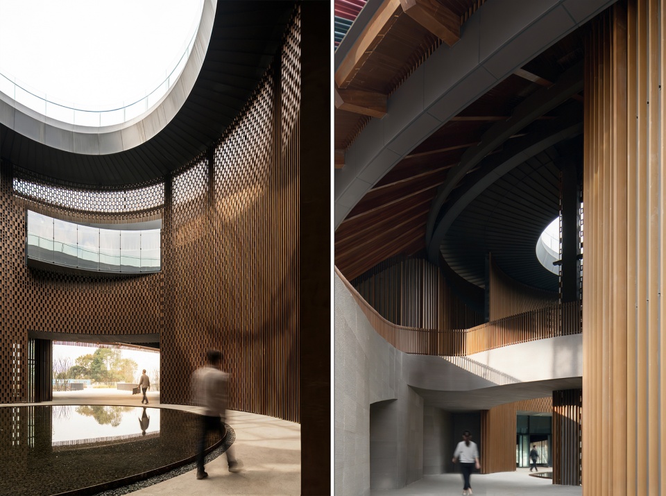 围绕中庭的弧形楼梯,让自然光线透过格栅洒落踏步,形成斑驳流动的光影效果,引导人拾级而上,可抵达屋顶平台俯瞰这片田野。既延续了传统建筑 “借景自然、虚实相生” 的意境,又为当代展示空间注入了温润的生命力。