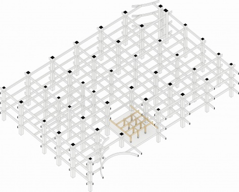 Although traditional “tie-beam” structures typically refrain from using mortise-and-tenon joints between column and beam, this project adopts semi-lapped joints to preserve structural coherence. Due to transport and installation constraints, full-length beams must be segmented, and the segment joints are likewise treated with half-lap joinery—making the structure legible while maintaining its crafted integrity.