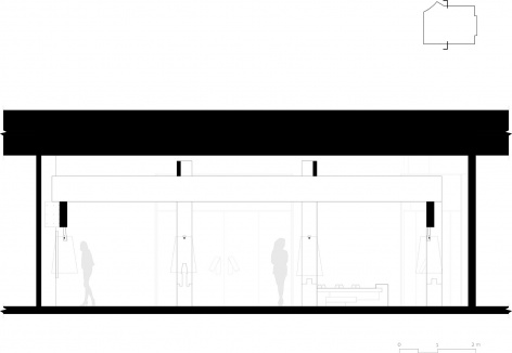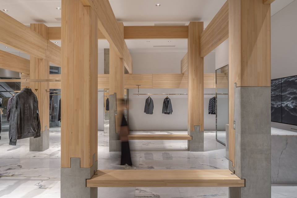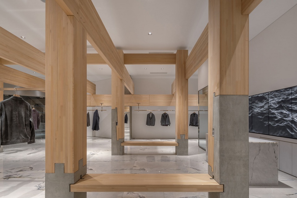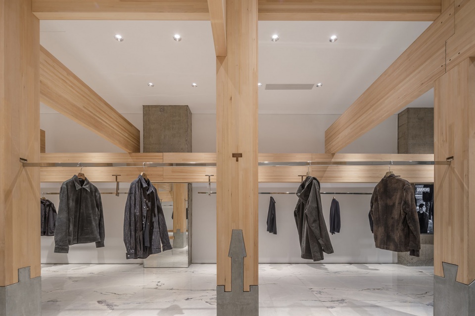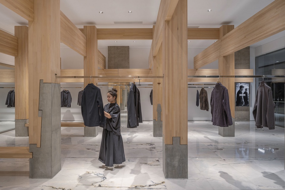 东方传统木构讲究家具与建筑构件的统一逻辑。店中的坐具通过榫卯方式卡入混凝土柱绌,使家具成为结构系统一部分;挂衣杆则预先在柱上开卯口,再将金属杆以卡榫方式嵌入,形成尺度由大至小而语言统一的建造体系。