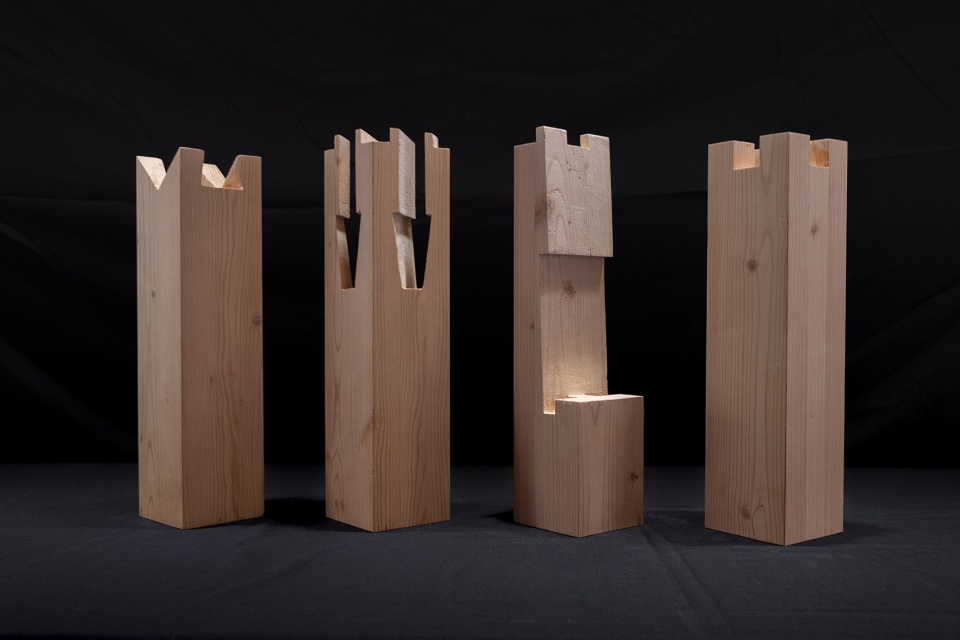 After extensive research and model studies of various joinery systems, four types were selected: the lateral-sliding “praying mantis” mortise from Nanchan Temple; a low, vertically interlocking cross mortise; a taller center-pinned palm mortise; and a more complex piece requiring a 45° spatial insertion path. These four systems differ in form, logic, and installation sequence, contributing to a rich layering of craftsmanship.