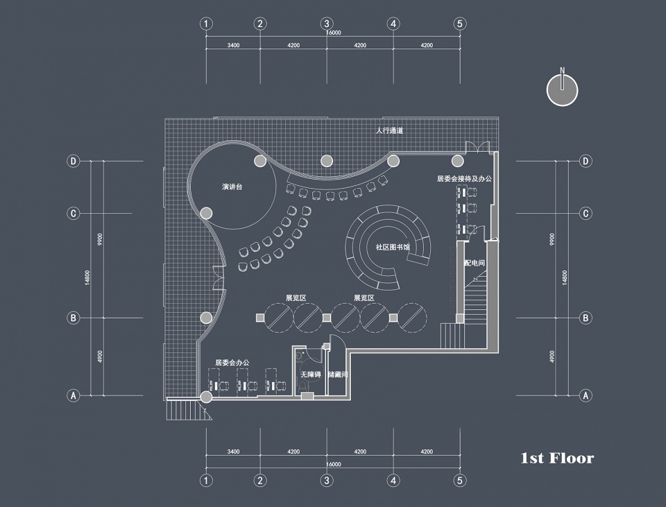 Through the 2022, you enter the building. On the first floor is an open hall, and the transparent round glass integrates the indoor and outdoor. Entering the gate, on the right is the community reception desk and guide. Facing the revolving wooden door, it forms a corridor when closed and becomes a community exhibition board and billboard when opened. On the left is an open hall. 0 in 2022 corresponds to the street corner and forms a 0 stage. Community residents can discuss, preach and perform programs here. Of course, passers-by outside these programs can see and join in. At the bottom is the book corner, where children can read and study.