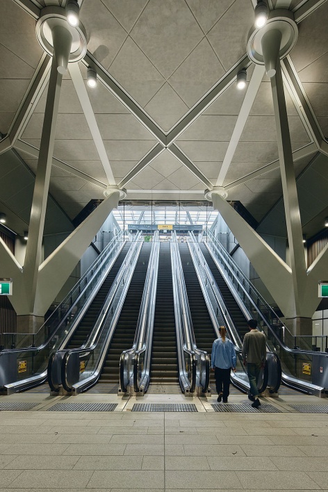 ▼州立图书馆站 – 主入口,12 米高立柱与巨型梁架构成庄重空间,State Library Station–Grand main entrance featuring 12m-high columns topped with massive beams