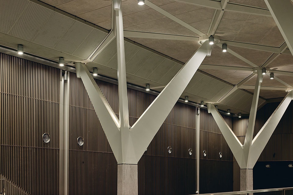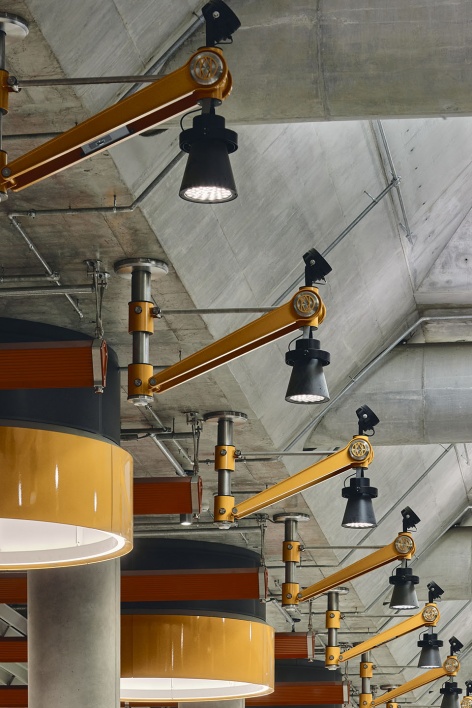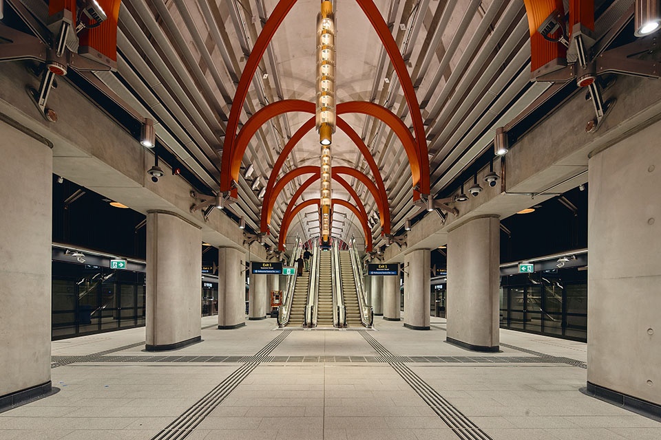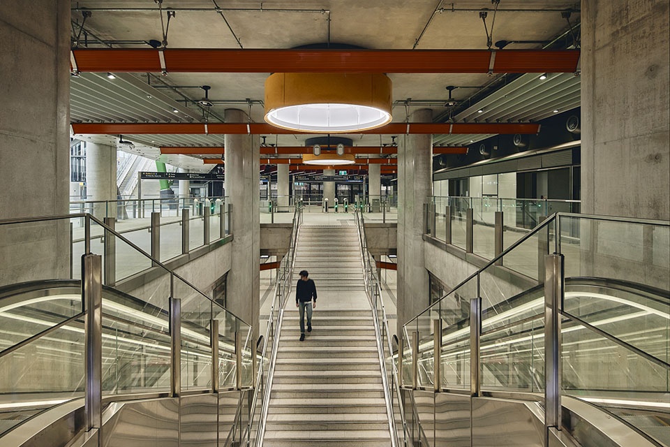 Throughout all of the stations a line-wide design element is immediately recognised as brightly coloured structures support all of the station’s services and hold a vast number of specifically designed light fixtures, cast in metal and featuring thousands of glass globes. Intuitive wayfinding is another line-wide feature, where brightly coloured metal baffles show commuters the way in and the way out of stations and guide them to their connections to other transport services.