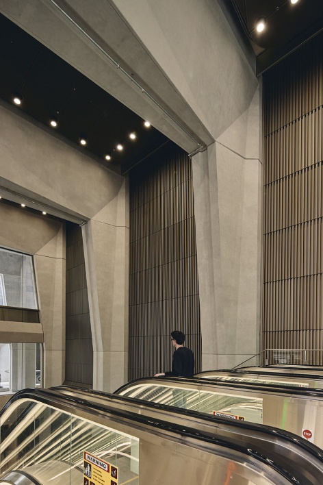 尽管州立图书馆站和市政厅站因位于繁忙的中央商务区且埋深较大,带来更高难度的设 计与施工挑战,设计团队仍以宏伟如大教堂般的地下空间应对,营造开阔通透、庄严壮 丽的氛围。车站主要入口也经过精心设计,引入自然光,使空间更加明亮宜人。