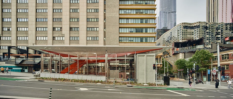 station, the large elliptical canopy located in the centre of St Kilda Road shelters the concourse below, flooding the new underground connections to the platforms with daylight and providing shelter to those connecting to the tram network.