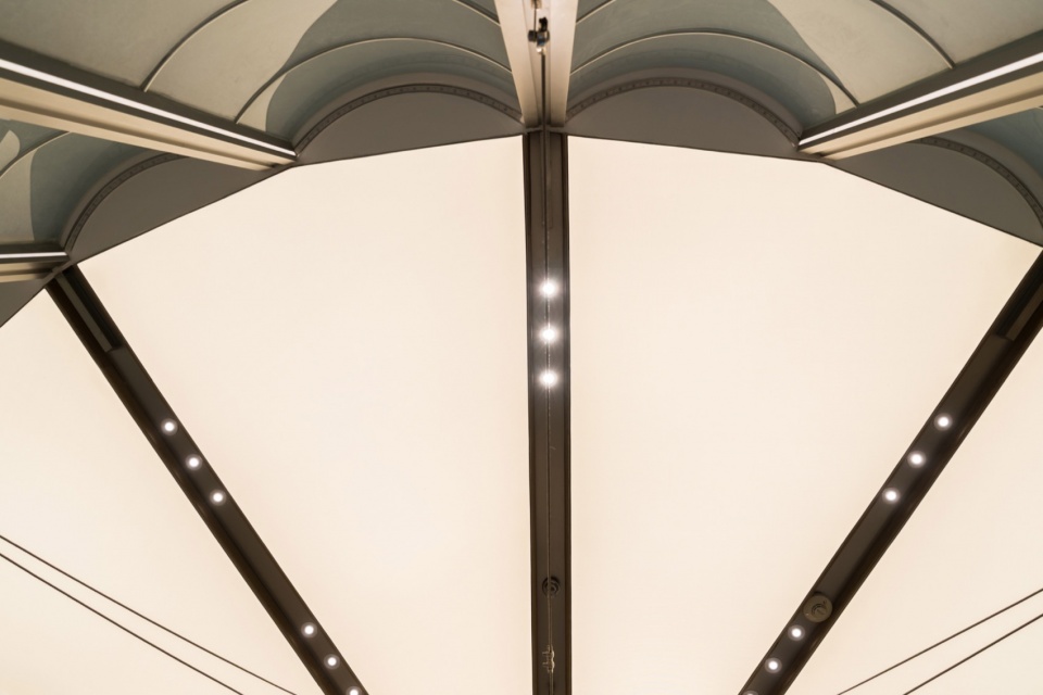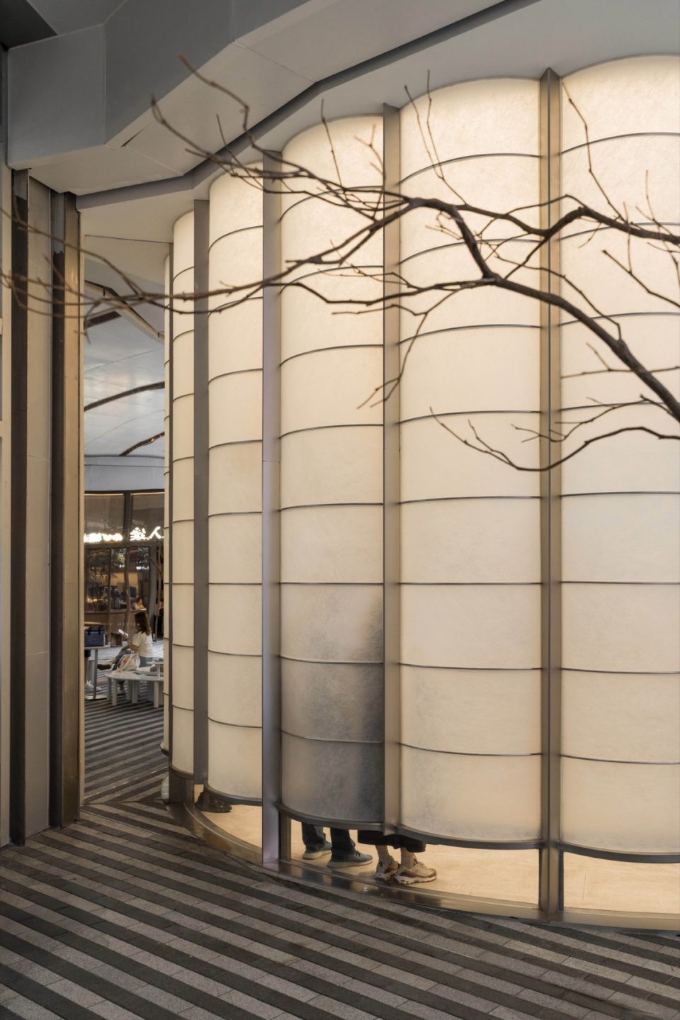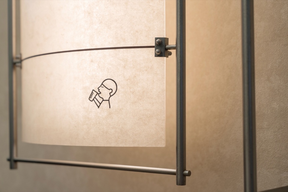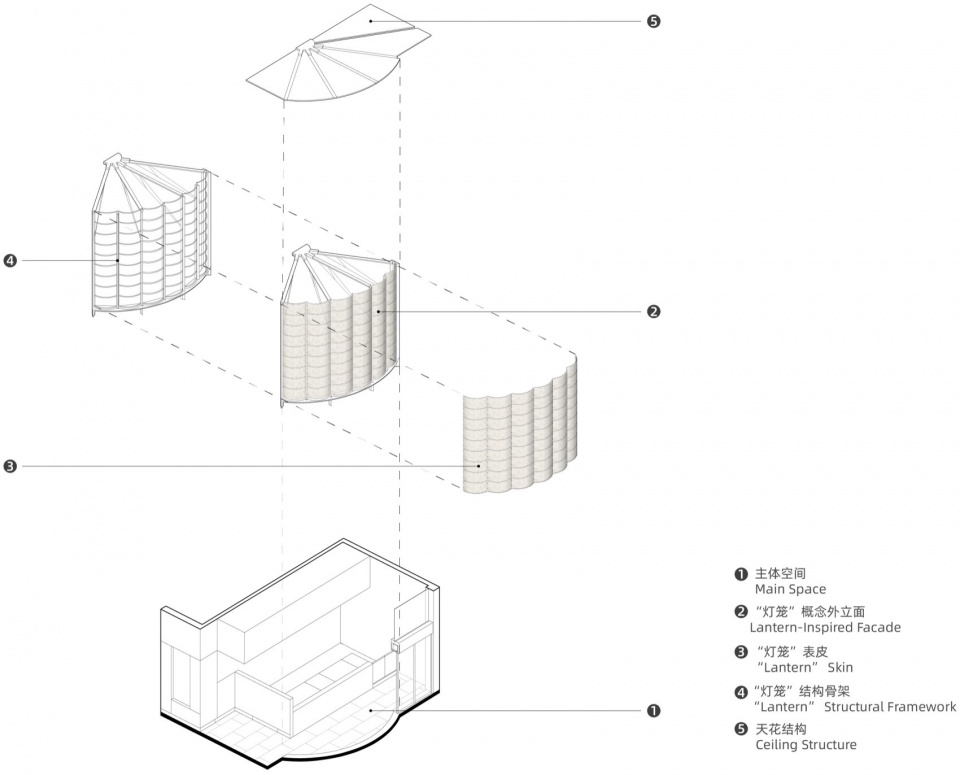 灯笼精巧的骨架结构被抽象化,升华为空间的脊梁与视觉框架。运用质感不锈钢,打造出简洁利落、富有几何美感的线条或网格系统。这些“骨架”不仅清晰勾勒出空间的层次与轮廓,带来通透、轻盈的视觉感受,更巧妙地成为内部装陈的依托。使用肤感夹特种纸复合玻璃替代以前的油纸,作为空间的“皮肤”,从而实现同样的温润的外立面质感。