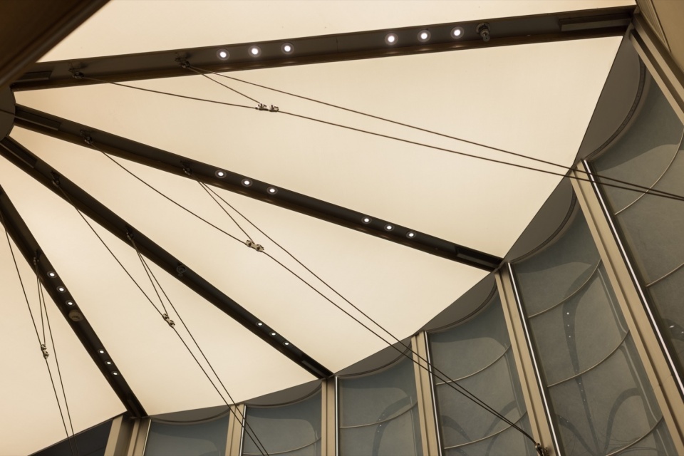 The intricate skeletal structure of the lantern is abstracted and elevated into the spine and visual framework of the space. Textured stainless steel is used to create clean, sharp lines or grid systems rich in geometric beauty. These “skeletons” not only clearly delineate the spatial layers and contours, offering a transparent, lightweight visual experience, but also ingeniously become the support for interior displays. We replace traditional oiled paper with a special paper-skin laminated composite glass, serving as the space’s “skin.” This achieves the same warm, textured quality for the exterior façade.