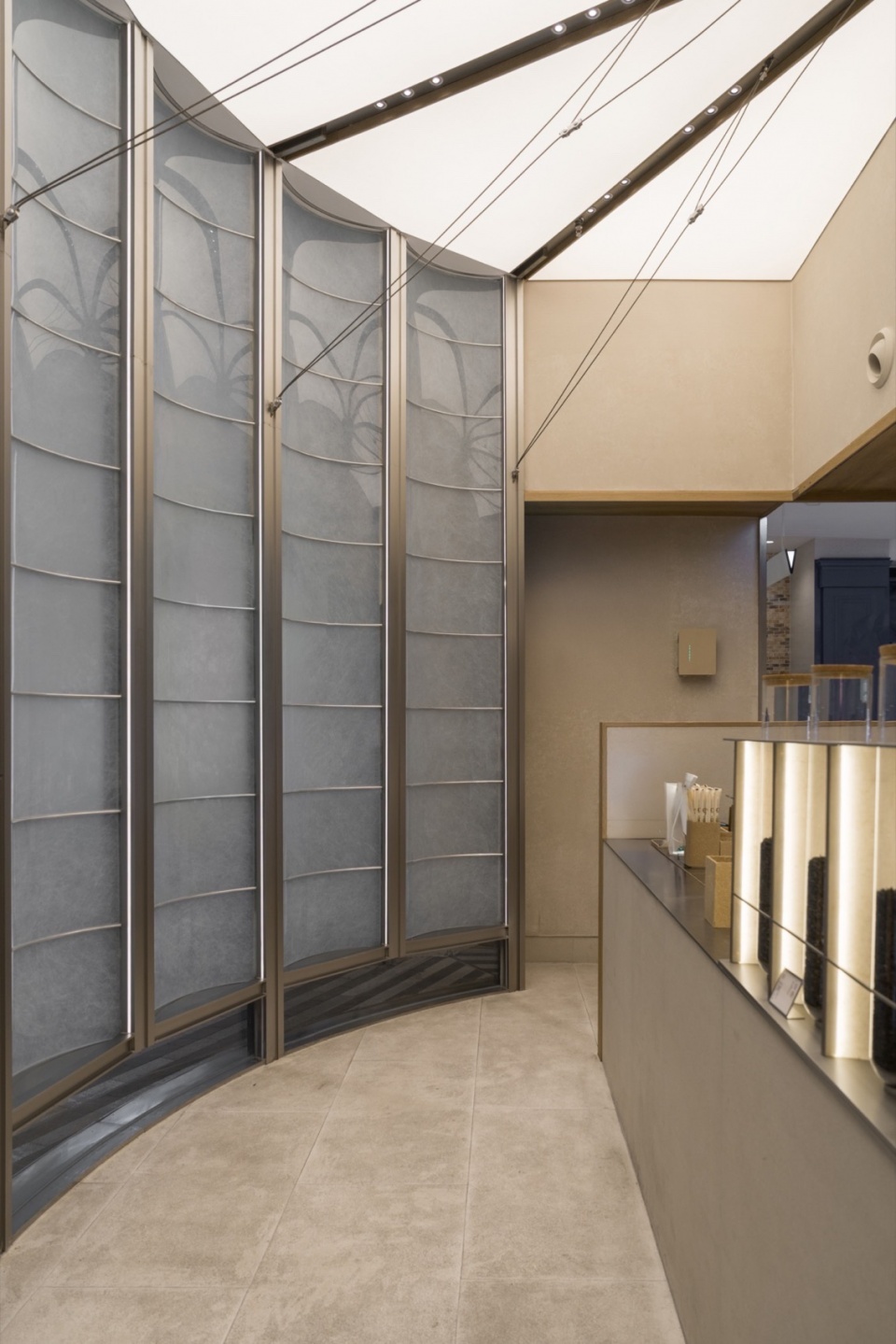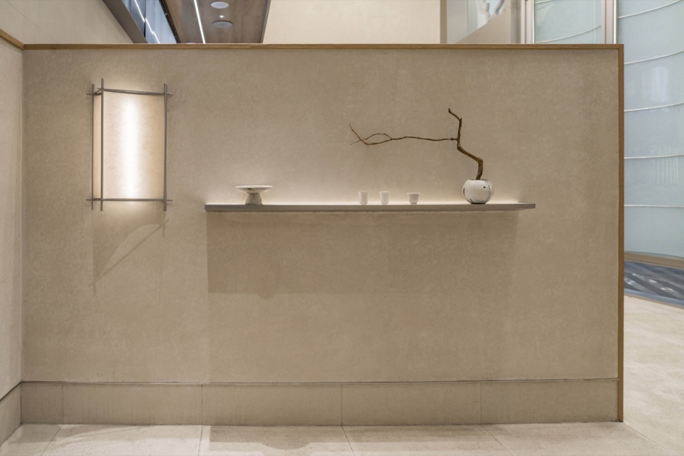 室内贯彻禅茶的概念, 整体空间追求极致的纯净与克制。细节的放大与感知:在这份纯粹之中,每一处精心设计的陈列细节都被无限放大——一盏孤灯的光晕、一件融合茶元素的艺术小品、一组悬挂的透光茶具、甚至灯光上流动的光影图案。顾客得以快速沉浸,并敏锐地感知到空间传递的细腻情绪、品质感与深厚的文化隐喻,享受“少即是多”的意境之美。