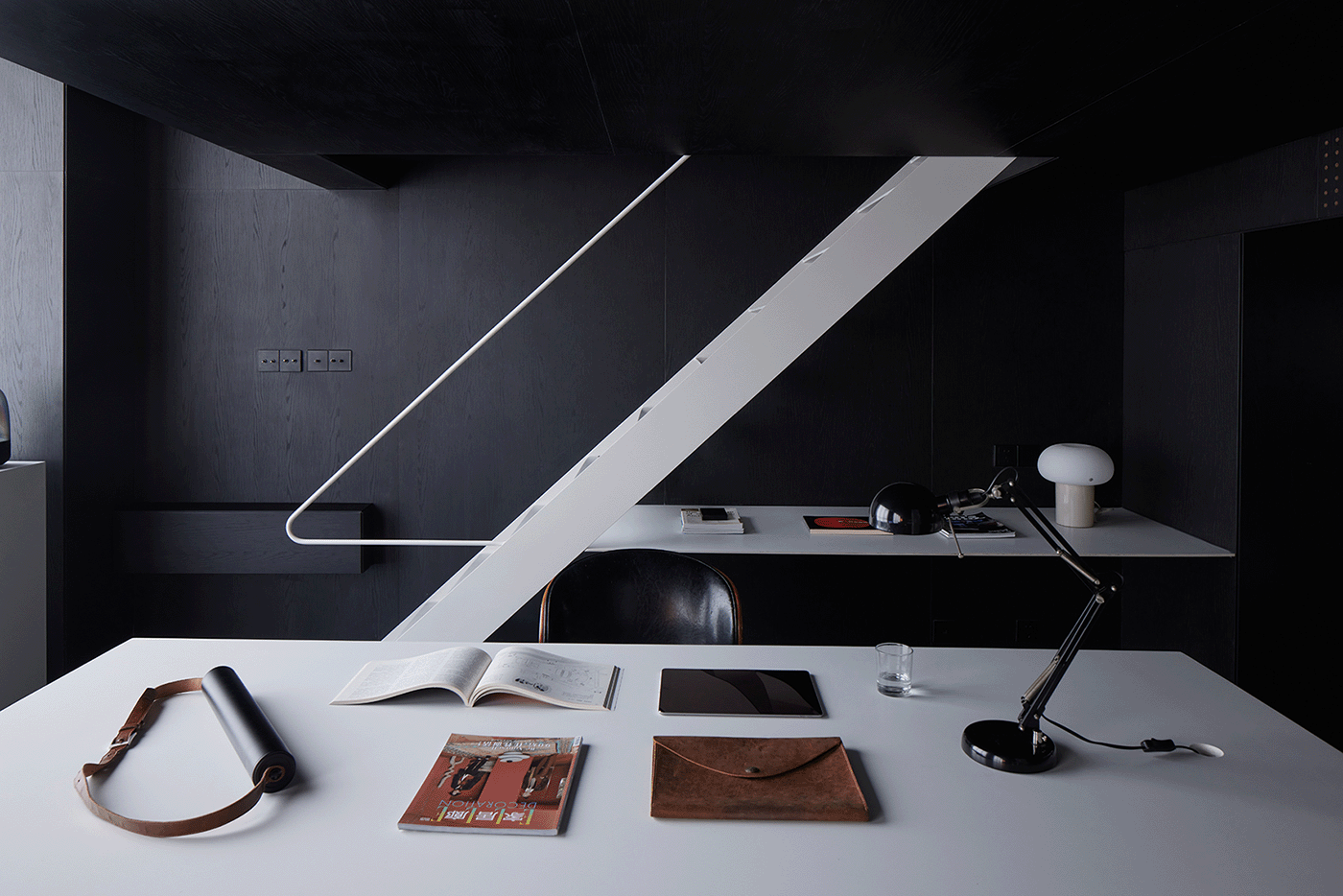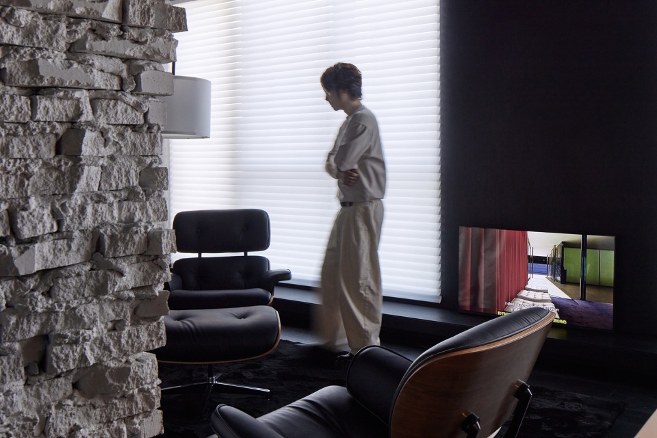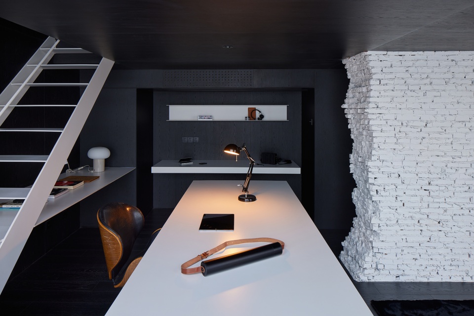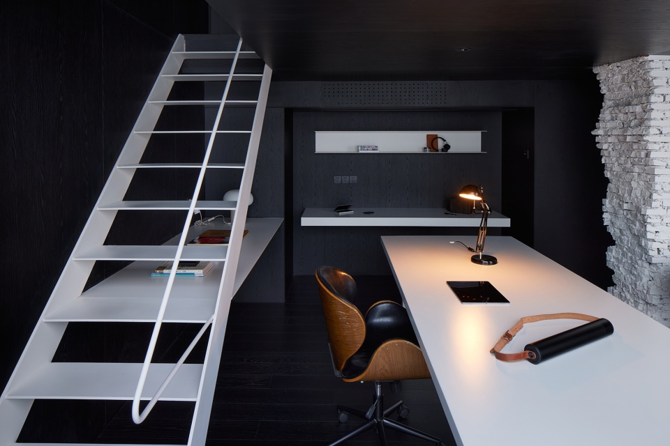 Only black and white are used in the space. A large area of black wood veneer serves as the base, and the “lightness” in color and the contrast in material of the white steel structure are used locally to break the heaviness of black. We place functional components such as furniture and stairs at the forefront to emphasize the dominance of the space. In terms of scale and form, we maintain a sufficient volume and a simple outline. Meanwhile, we set back the storage system and the basic walls, ceilings and floors, reducing their presence through uniformity and continuity, thus creating a strong figure-ground relationship between the two. Present the spatial order in a clear hierarchy and shape a living space that combines texture and practical efficiency.