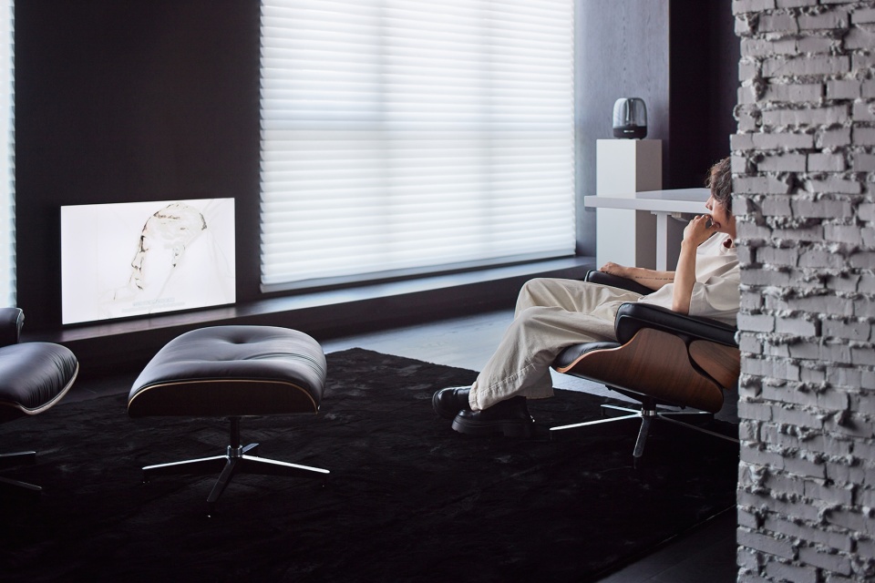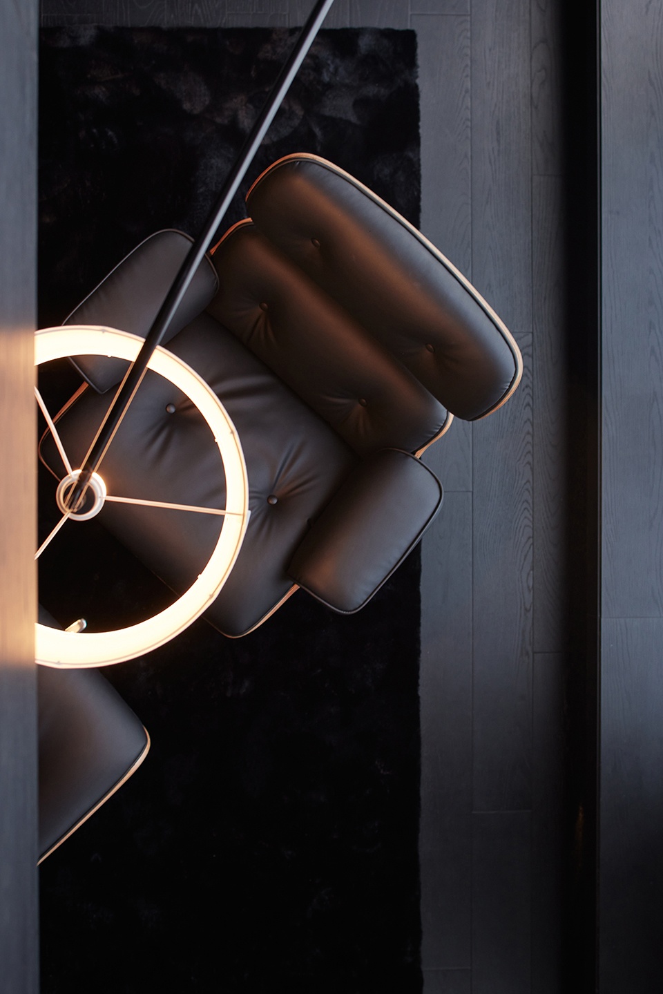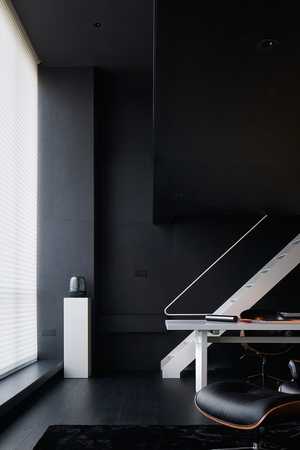 空间中仅使用黑白两种颜色,大面积的黑色木饰面作为基底,局部以白色钢结构在颜色上的“轻量感”和材质上的对比打破黑色的厚重。我们将家具、楼梯等功能性构件前置,以强化空间的主导性。在尺度与形态上,保持足够的体量与简洁轮廓。同时,让收纳系统及基础的墙顶地后退,通过统一性与连续性弱化存在感,让两者形成对比强烈的图底关系。在清晰的层级中呈现空间秩序,塑造兼具质感与实用效能的居住场域。