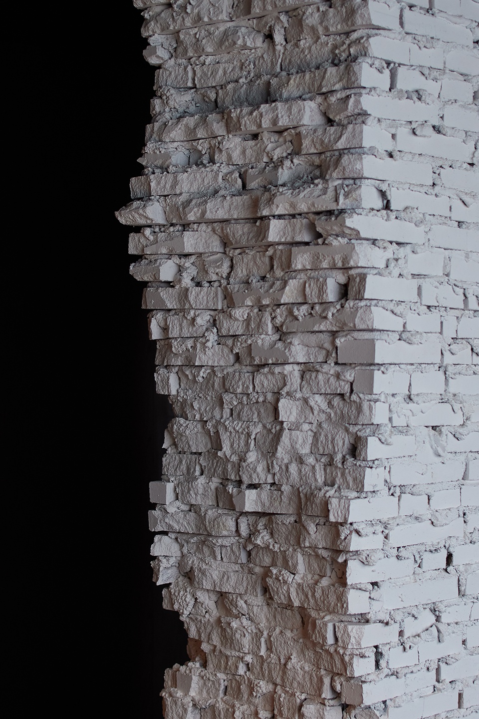 粗粝质感源于对材料原始性的保留与呈现,以原生肌理与不规则触感,传递天然的肌理变化成为空间的 “隐性装饰”。我们用白砖堆叠出一道残缺的墙体来弱化空间中心的管道井,不规则的形态和原始的砌筑肌理与四周饰面形成材质张力,成为空间的视觉锚点。板材的细腻与砖墙的颗粒感同时形成了触觉层次。