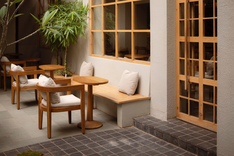 The vision began with a simple brief: to create a space that was functional, soothing, and memorable. The design team at Val Atelier found their answer in Japandi, a style that marries the quiet simplicity of Japanese wabi-sabi with the cozy embrace of Scandinavian hygge. What emerged is not just a café but an experience, where every detail, from the slate roof to the limestone flooring, has been chosen to resonate with balance and restraint. The building itself carries a story. Once an old 1970s home with low ceilings and heavy walls, it has been completely reimagined into a double-height, light-filled retreat. Pinewood windows stretch tall and wide, framing lush green views while flooding the interiors with natural light. Despite the recurring grid patterns on the floors, walls, and ceilings, nothing feels rigid, instead, the repetition creates a soothing rhythm, much like the consistency of a well-measured pour-over.