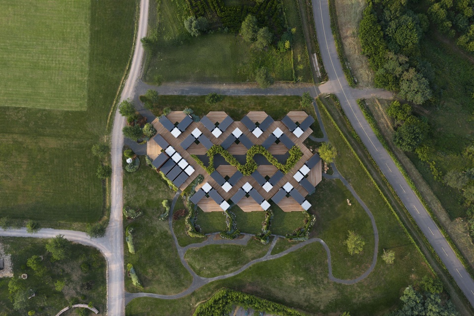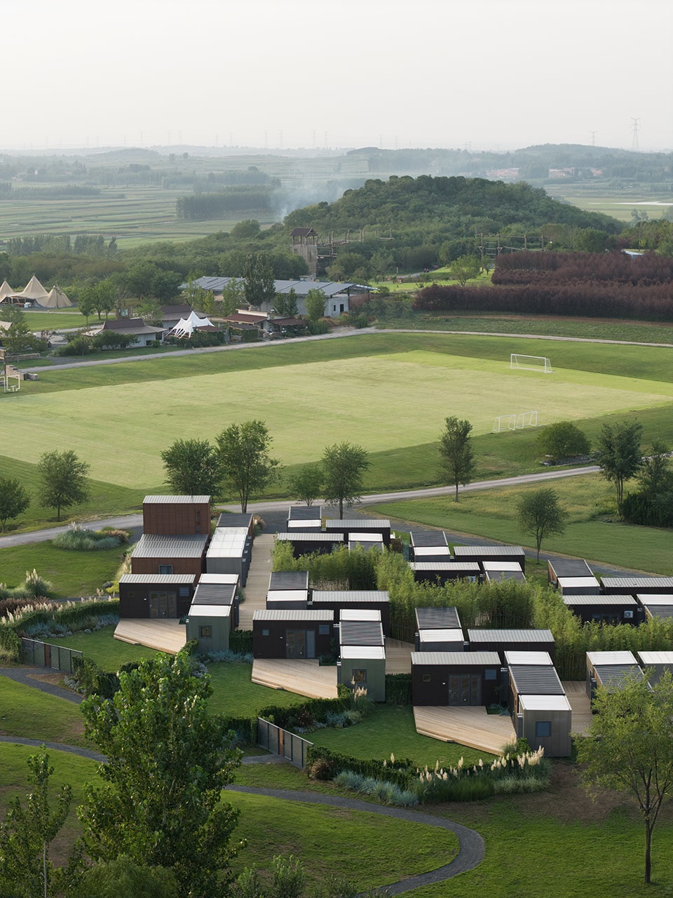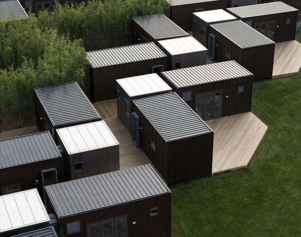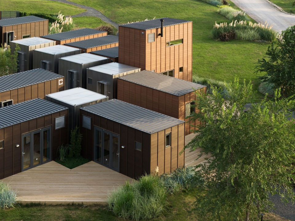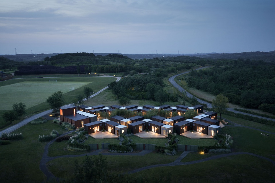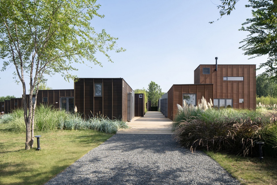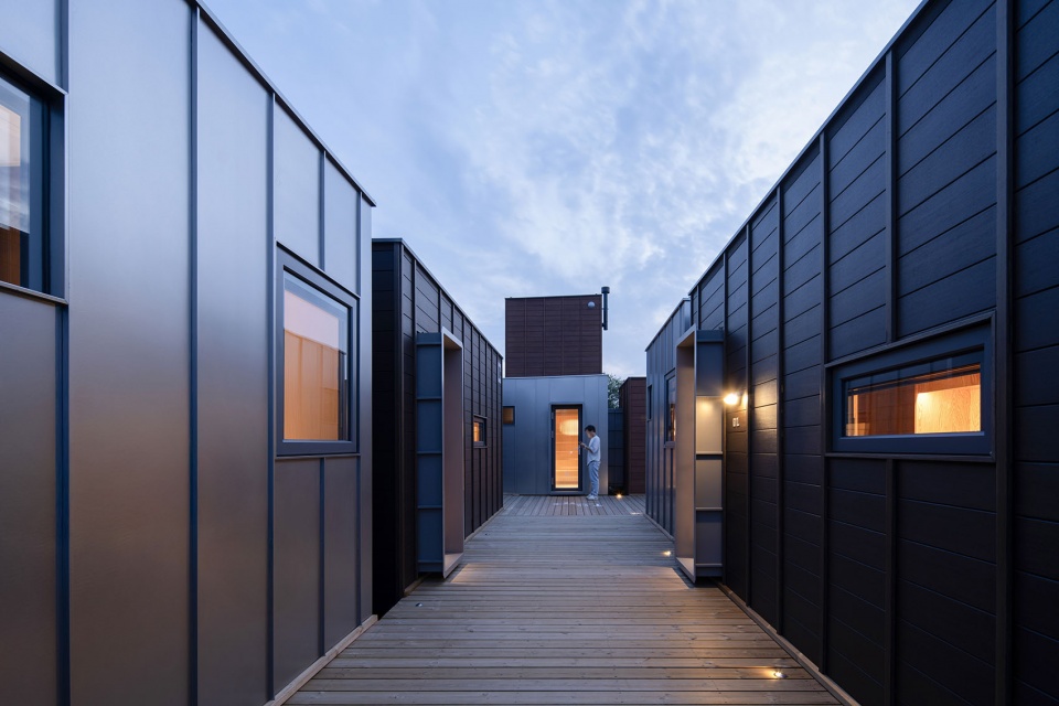 组团灵活:多个户型由栈道平台串联在一起,可以根据场地轮廓和地形高差形成相应的组团。栈道是组团内的交通网络,同时也是系统设备管线铺设的路径。