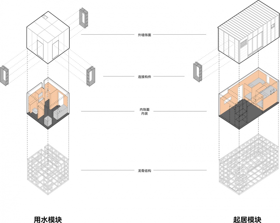 起居模块的内部可根据需求灵活容纳双人间卧室,四人间上下床,榻榻米客厅等布置方式。用水模块则可作为卫生间,厨房,公共淋浴间,设备间等使用。