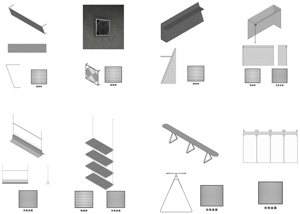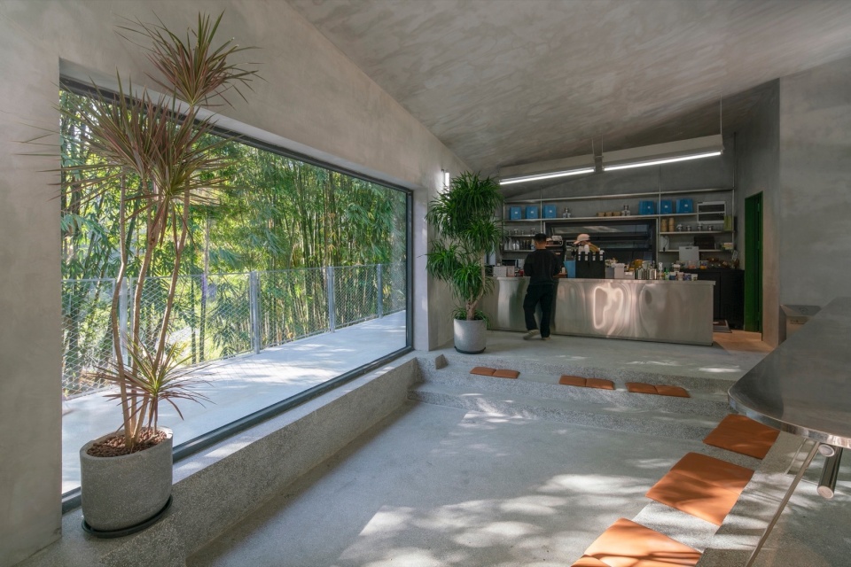 室内家具建构化,采用灰色金属台面+三角钢结构支架的组合,搭配粗糙的混凝土墙面,强化了材质碰撞的趣味。