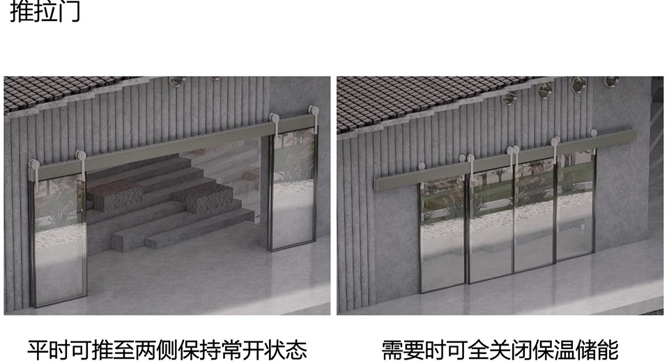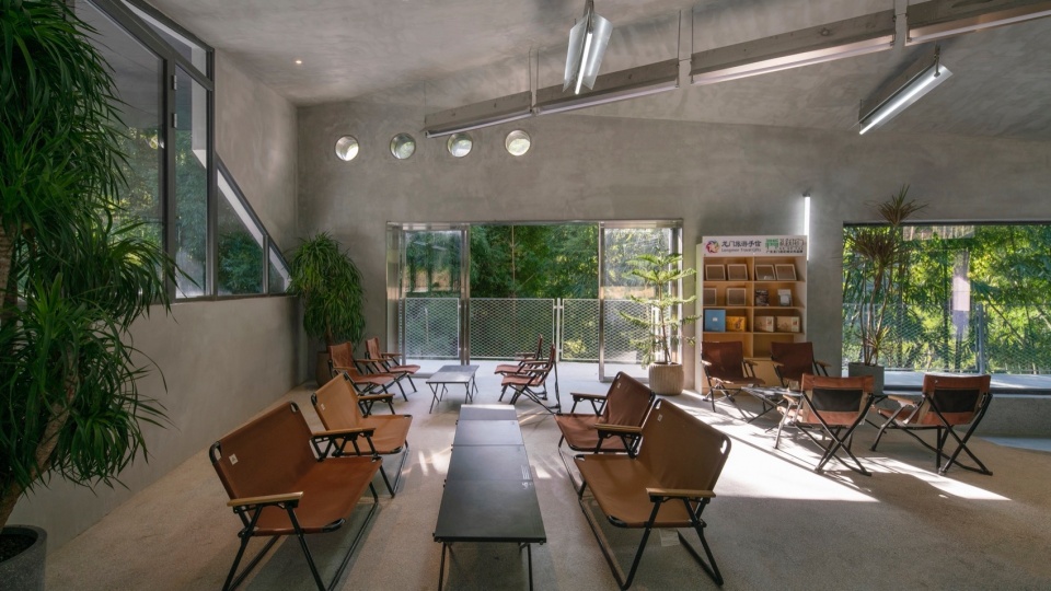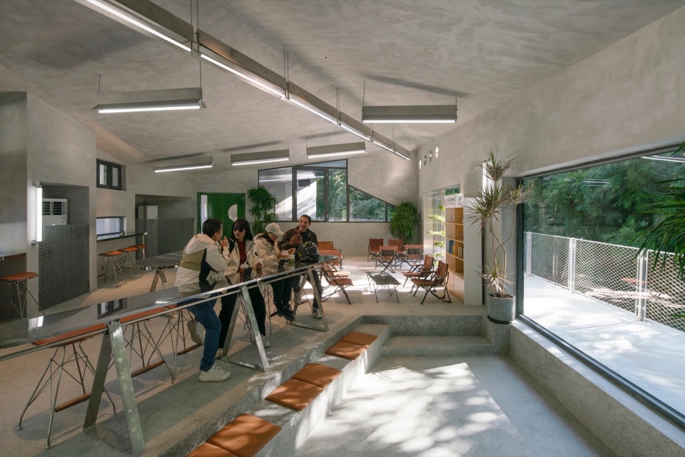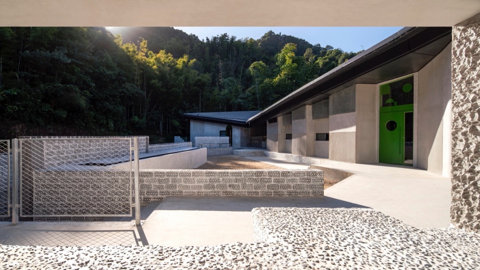 The doors, windows, and exhaust outlets on the facade are also treated with tectonic intent. The doors and windows integrate green paint, mirror-finish stainless steel, and glass, creating visual focal points on the concrete walls that blend harmoniously with the natural hues of the wilderness. The exhaust outlets are embedded in the vertically textured fair-faced concrete walls, adopting an industrial style with steel grids and metal frames that form a striking contrast with the ruggedness of the concrete.