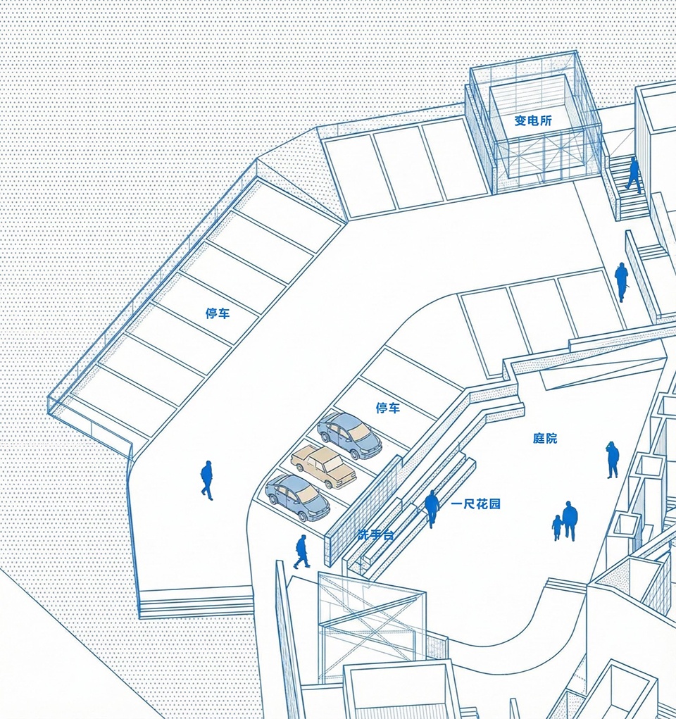 三个坡屋顶如流水般相接,托起人间烟火——骑行停靠点洒落着工具碰撞的清脆声响。