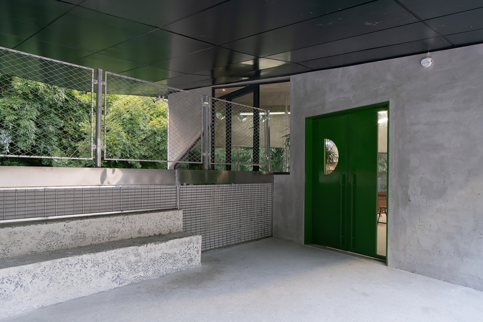 立面上的门窗与排风机口建构化,门窗设计结合绿色涂料+镜面不锈钢+玻璃,在混凝土墙面上形成视觉焦点,融入荒野的自然色彩;排风机口嵌入竖向纹理的清水混凝土墙面,以钢格网+金属框架的工业风设计,与混凝土的粗犷形成对比。