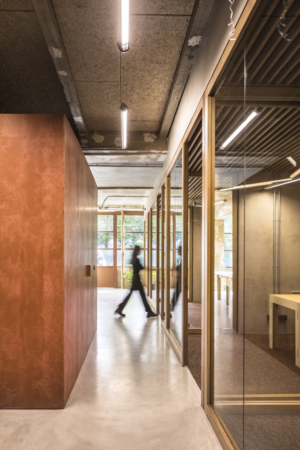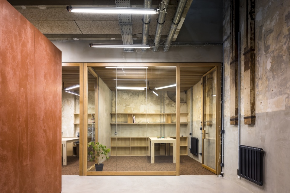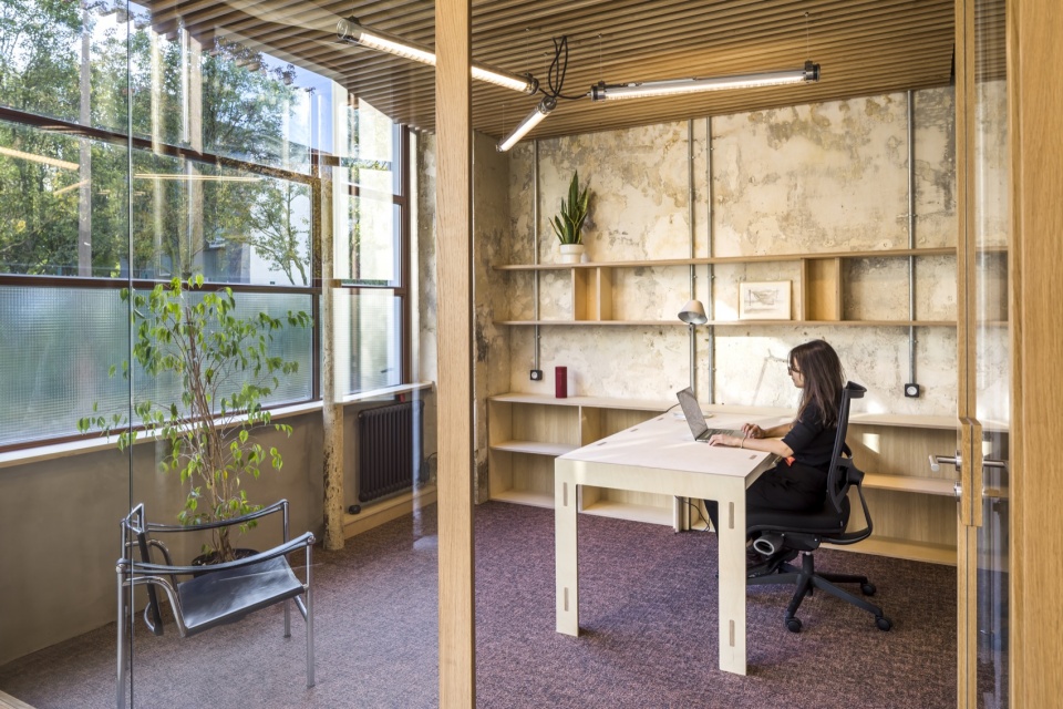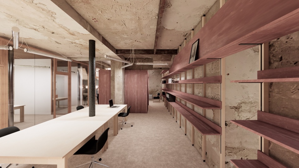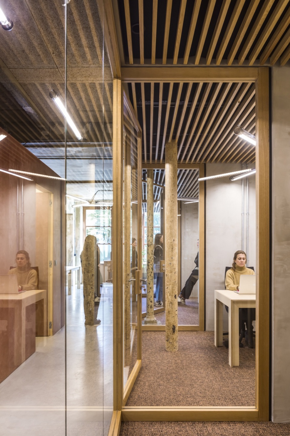 墙面与天花板的原始状态被完整保留,作为场地工业历史的记忆。项目在这一真实而粗粝的基底之上展开,并通过与精准而克制的介入形成对比,从而加以强调:家具选用橡木与桦木,酒红色木—混凝土板材(Viroc),带有锈色包浆的外部钢制门窗,封闭办公室内铺设地毯,公共区域则采用抛光混凝土地面。这一材料组合在原始质感与内敛精致之间建立起对话。