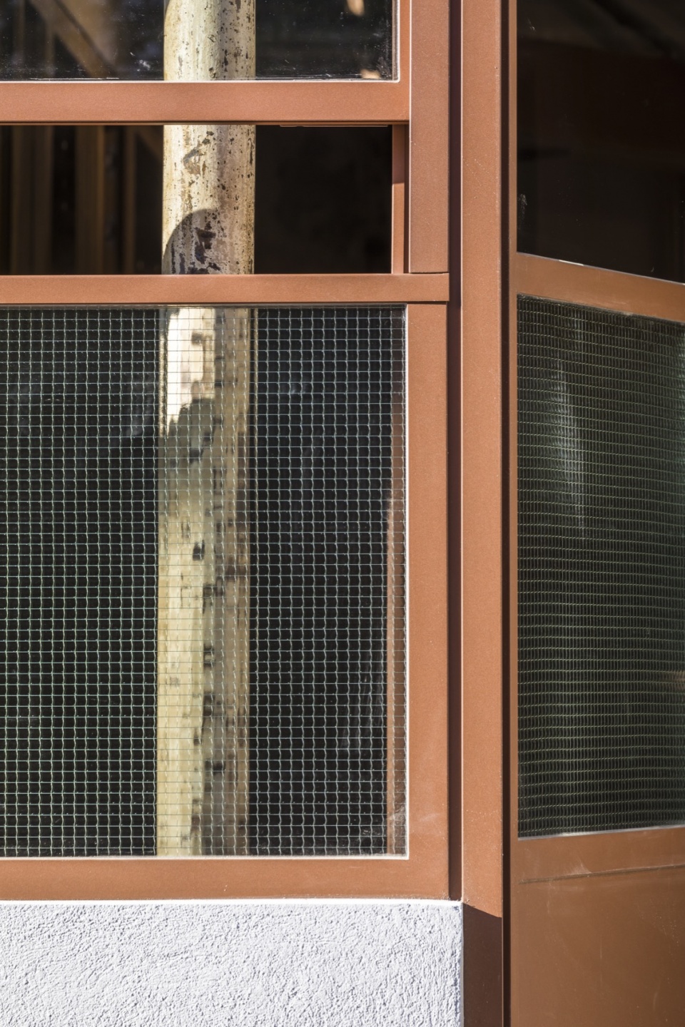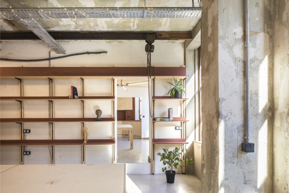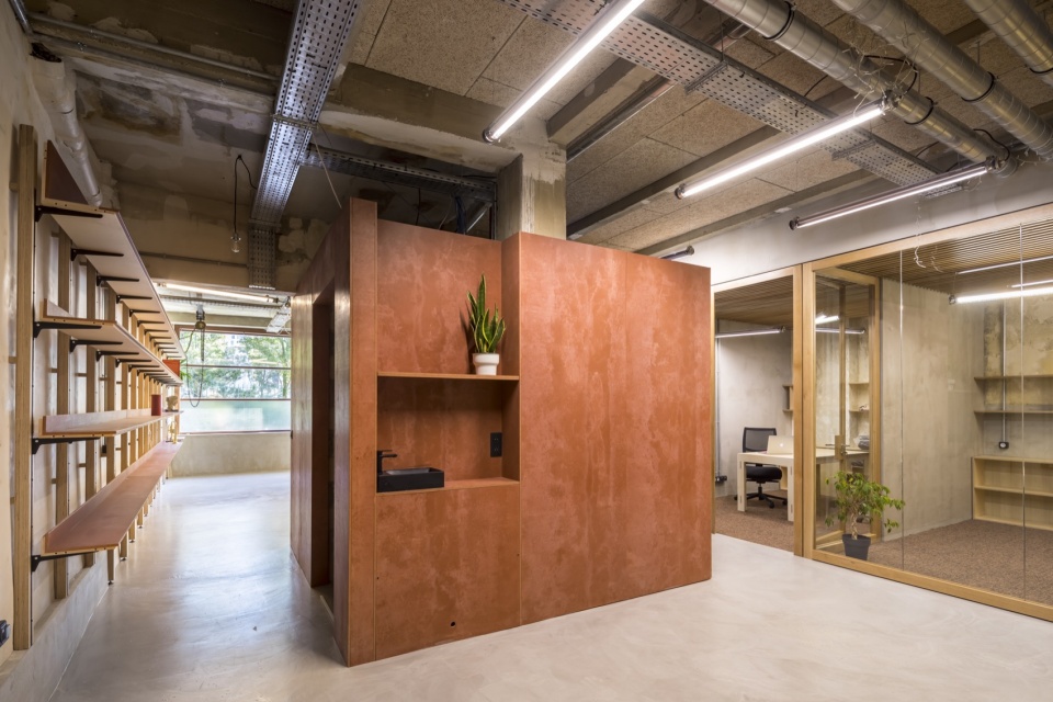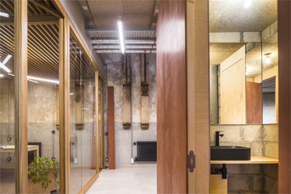 The raw state of the walls and ceilings has been preserved as a memory of the site’s industrial past. The project builds upon this authentic base and highlights it through contrast with precise interventions using noble materials: oak and birch for the furniture, burgundy wood–concrete panels (Viroc), exterior steel joinery with a rust-colored patina, carpet in the enclosed offices, and polished concrete in the common areas. This combination creates a dialogue between raw materiality and understated sophistication.