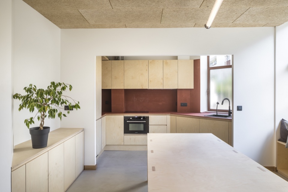 The kitchen adopts a different treatment from the rest of the space: whitewashed walls, a wood-fiber false ceiling, and polished concrete flooring. A bespoke birch kitchen with a red Viroc countertop unfolds here, extending the material palette while offering a softer, more domestic atmosphere.