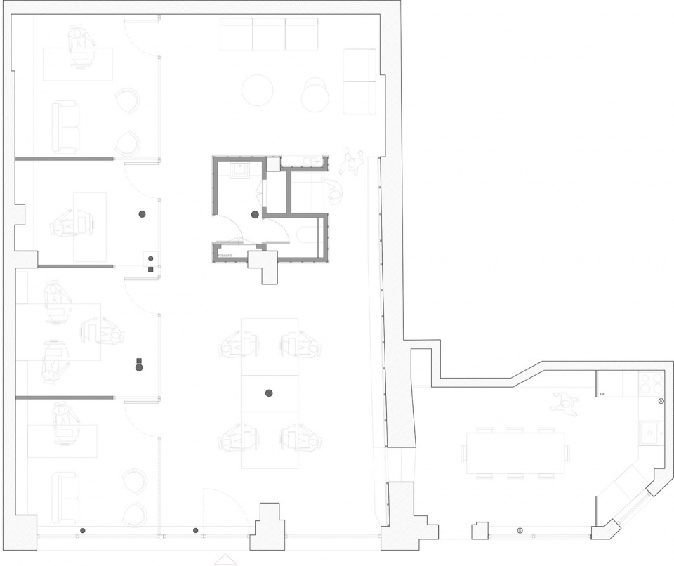 Rather than multiplying masonry interventions, the interior architecture is organized around a set of custom-made joinery elements. A long glazed partition with wooden frames structures the layout and separates the four enclosed offices from the open space. Each office benefits from an oak acoustic false ceiling and built-in birch furniture, while a burgundy carpet provides a warm atmosphere.