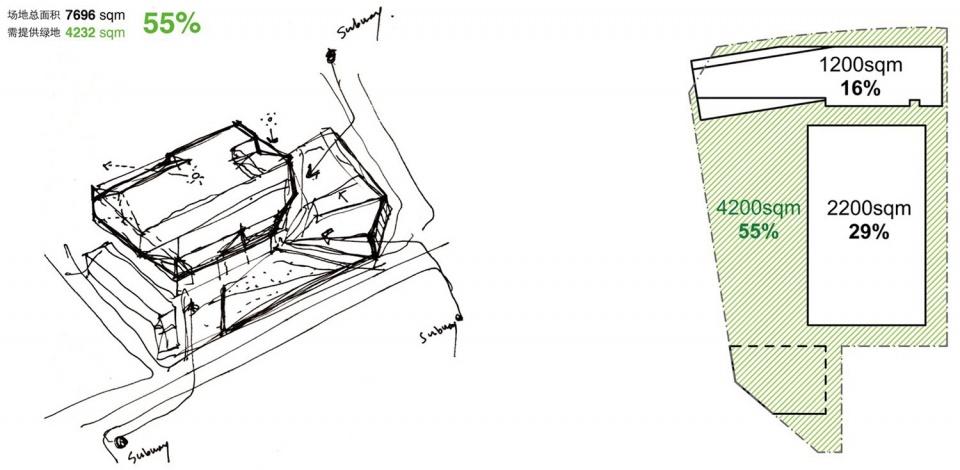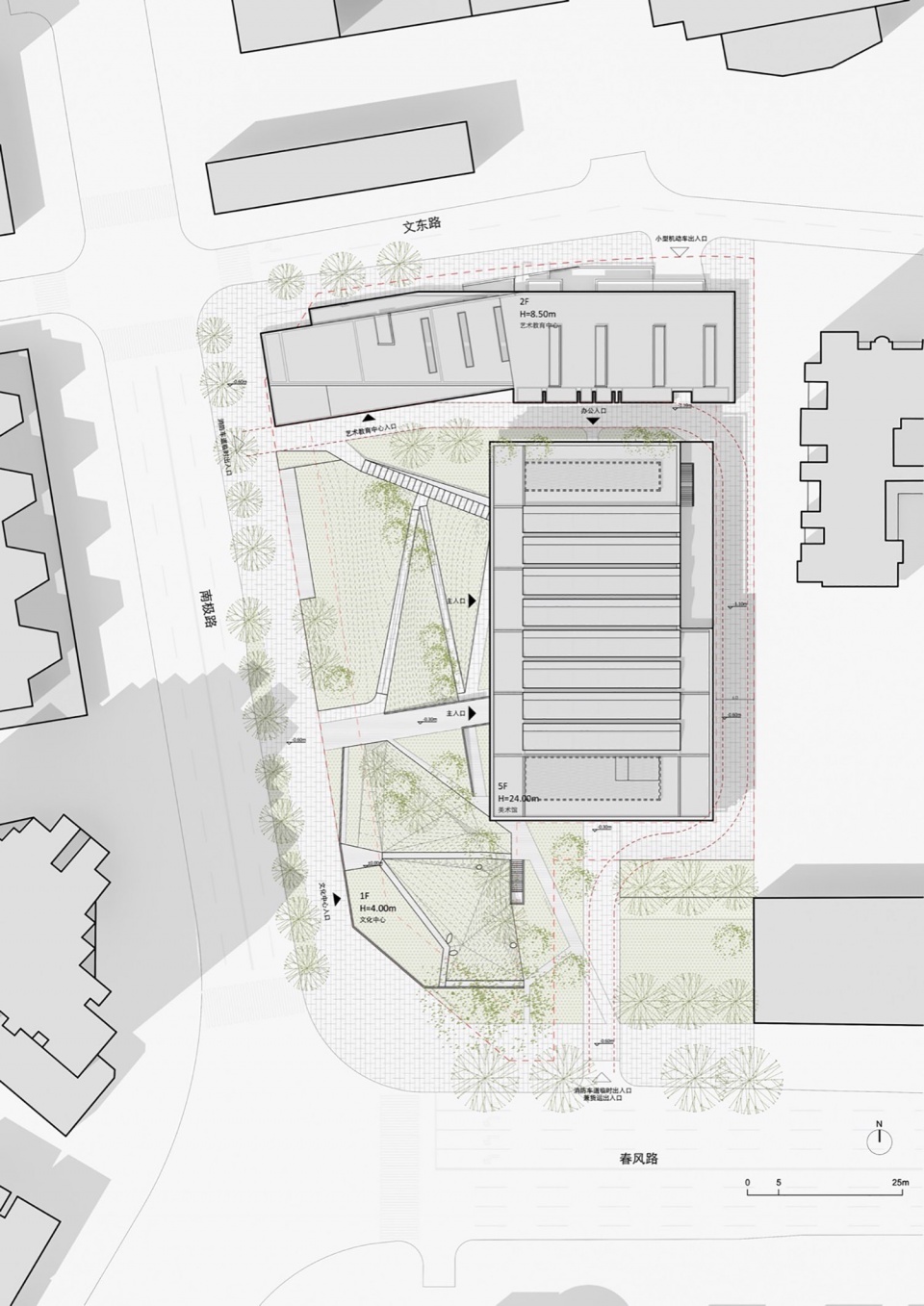 和大多数屹立于空旷场地中的美术馆不同,罗湖美术馆周边高层环绕,扩建五倍建筑规模的同时保持55%绿地率是一个艰巨的挑战。我们的策略是变挑战为机遇,塑造一个充分融入公园中的美术馆;与社区近距离的交融,使得美术馆更方便的实现公共教育使命,服务片区与城市的混合业态将为美术馆更可持续的运营提供支撑。我们将绿地置于西侧道路旁,使其具备最大的公共性和可达性,也为美术馆带来一个富有想象力的前场空间。