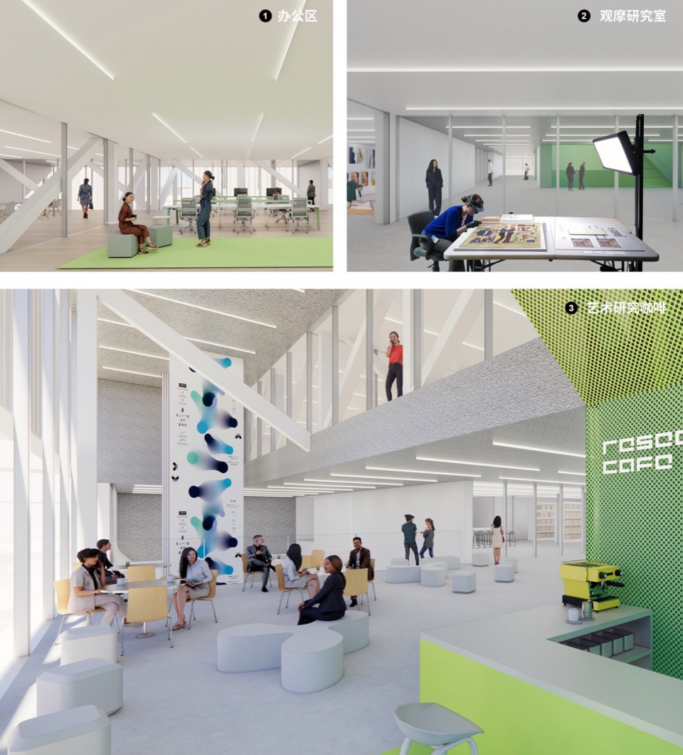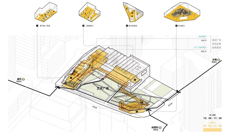 在动线设计方面,多样的动线设计允许不同长度的参观路径。我们特别关注美术馆运营时间范围内外的不同动线场景,允许文化设施和公共教育中心拥有不同的运营时间,甚至7天24小时开放。此外,资深的艺术爱好者还可前往漂浮画廊三层研究室观摩研讨,并可以在相邻的沙龙咖啡厅和艺术研究者互动交流。美术馆办公区设置在四层临近研究区域,工作人员可以从漂浮画廊北侧的独立入口和专属电梯到达。