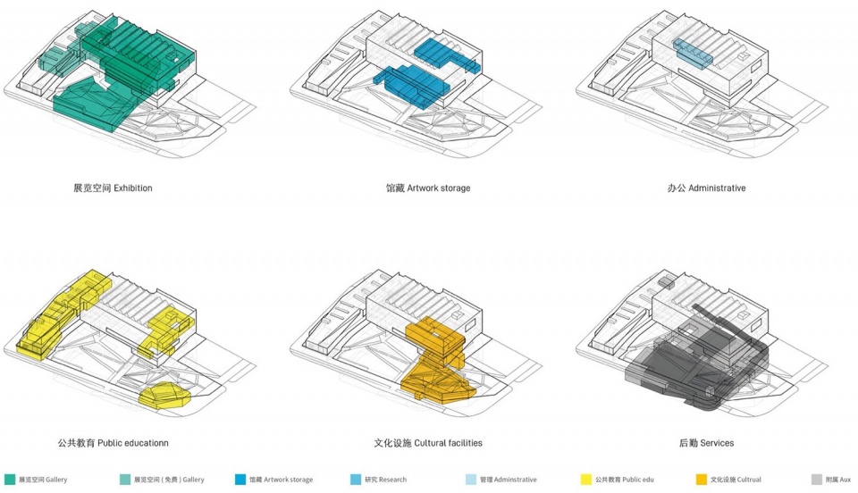 In terms of circulation, diverse routes allow for visits of different durations. We paid special attention to circulation scenarios both during and outside museum operating hours, enabling cultural facilities and the public education center to have different schedules, even operating 24/7. Additionally, seasoned art enthusiasts can visit the research room on the third floor of the Floating Gallery for observation and discussion, and interact with art researchers in the adjacent café. The museum office area is located on the fourth floor near the research zone, accessible via an independent entrance and dedicated elevator on the north side of the Floating Gallery.