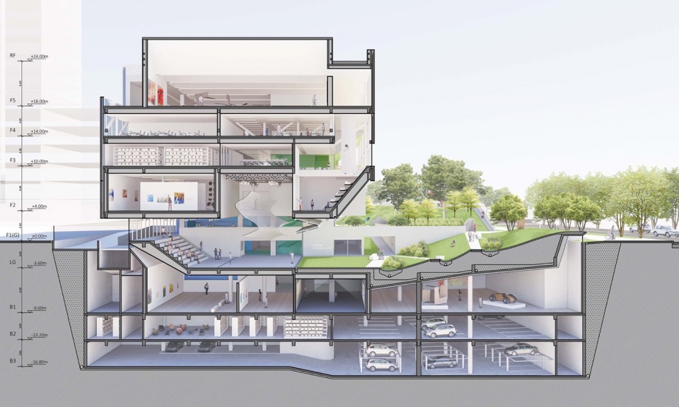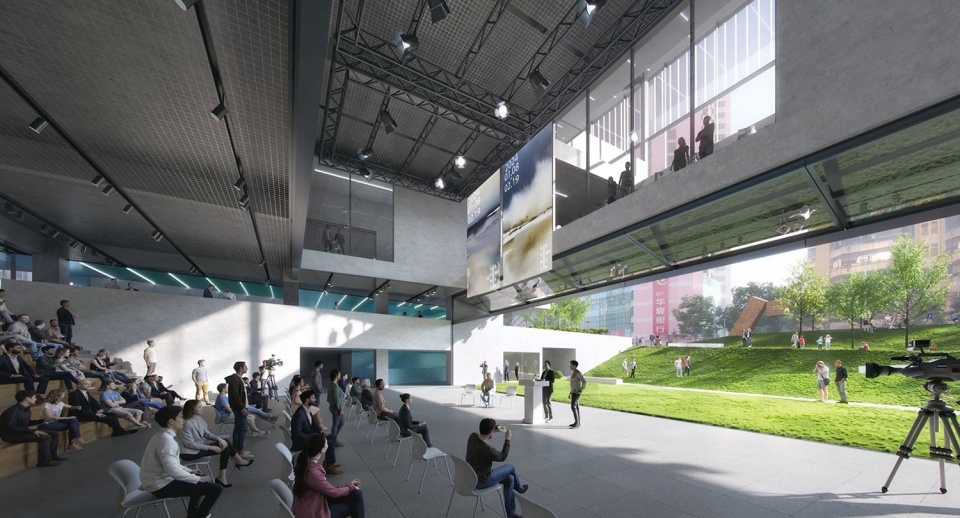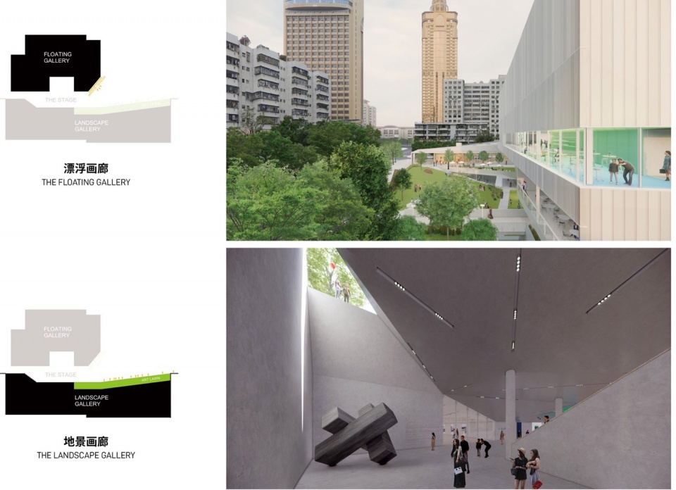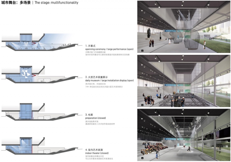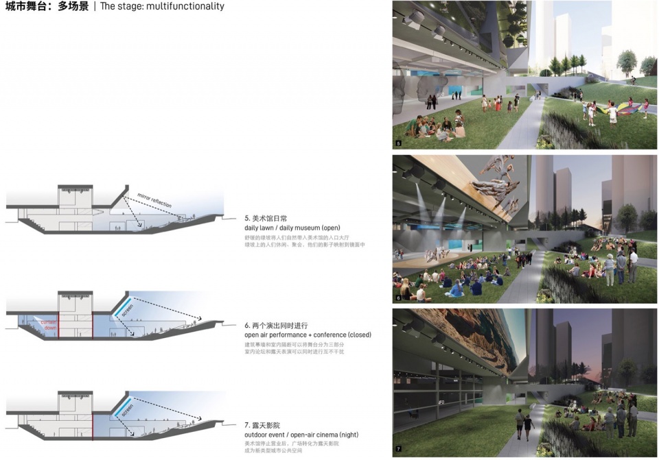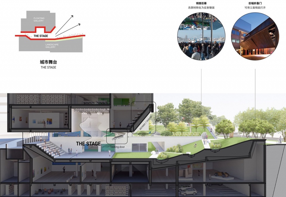 在剖面上,美术馆分为漂浮画廊与地景画廊两个部分,中间嵌入城市舞台,舒缓的绿坡将人们自然带入美术馆的入口大厅。入口上方倾斜的镜面巨幕面向艺术草坪,每个人都可以看到自己,让日常的生活场景转化为艺术本身。艺术不再是高高在上曲高和寡,而是融入生活的日常,最大程度的激发公众对艺术的好奇和参与感。镜面亦是大屏幕,可以完全打开的建筑立面,室内台地和室外绿坡形成的双面舞台,可激发多种有想象力的使用场景,草坪音乐节、露天电影院、实验性新媒体艺术都可以在此发生。立体通高无柱的大厅空间,舞台式天花设计,为大型艺术装置展示、展览开幕式、演出等多种场景提供理想的空间和设施。在平面上,整个美术馆分为三个部分。除新的画廊体量外,北侧保留建筑成为公共教育中心,南侧三角地容纳文化设施。三者各有独立入口,又彼此相连,提供灵活的运营可能。