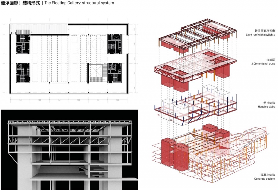 The Floating Gallery is supported by two structural cores at the north and south ends via spatial trusses. The exhibition space plan consists of a 10×20 grid on the top floor and 10×10 grids on other floors, allowing visual transparency and interaction between different levels. The U-glass facade creates a veil-like skin, providing diffused natural lighting. The large gallery on the top floor has a single-layer area of 2000 square meters, with a modular space easily divisible for different art exhibitions. The sectional design of the skylight introduces indirect light, and variable light-filtering curtains further provide variable lighting settings for different art forms.