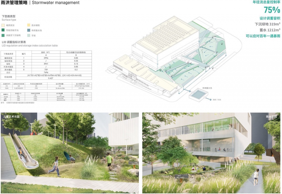 Through an integrated architectural and landscape design, the renovated museum reestablishes a more water-friendly connection: multi-level ecological and sponge measures combine storage, retention, purification, and utilization, cleverly using various spaces to develop blue-green combined rain-adaptive landscapes, ensuring water safety for all building spaces. Sufficient additional waterlogging storage facilities are reserved in the underground engineering to address risks from extreme storm events similar to the 2023.08.26 incident. As a new urban public space, Luohu Art Museum offers the public an experiential process of water and nature, integrating art and ecology into a new vision of daily life.