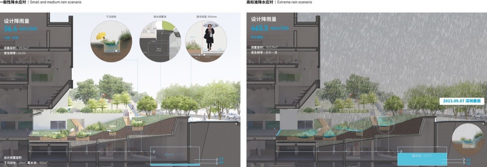 改造后的美术馆通过建筑与景观一体化的整合设计,重建与水更友好的连接:多级生态与海绵措施,蓄滞净用相互结合,巧妙利用各类空间发展出蓝绿结合的雨水适应性景观,确保所有建筑空间的水安全。地下工程中还预留足够的额外蓄涝设施,以应对类似2023.08.26高标准暴雨事件带来的风险。作为新的城市公共空间,给大众带来水与自然的过程体验,让艺术与生态构成日常生活的新图景。