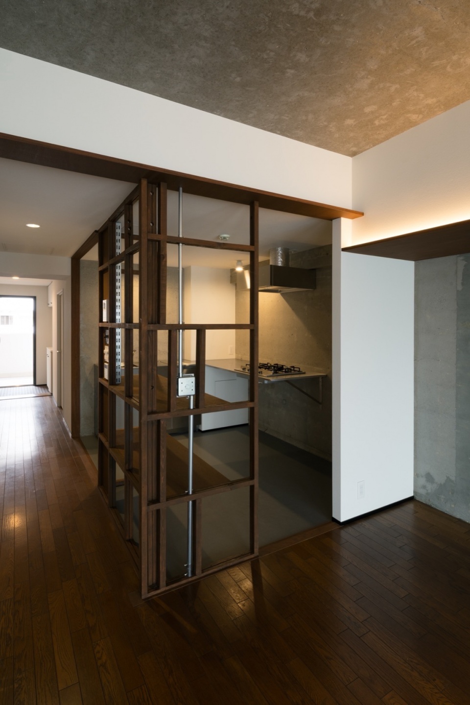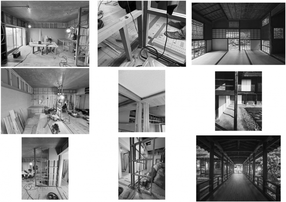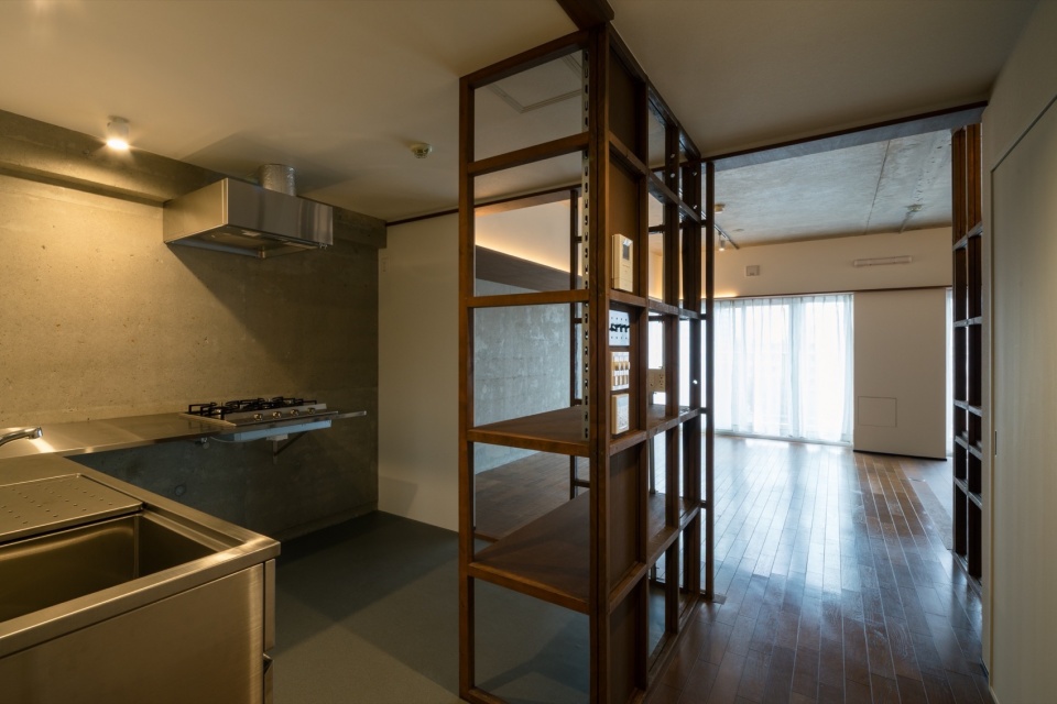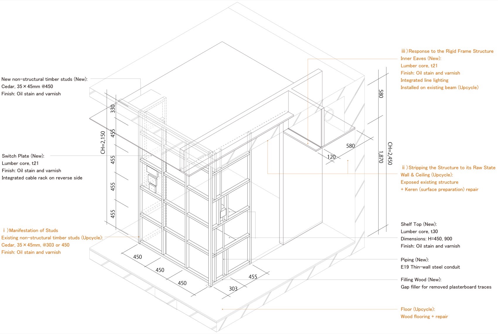ⅰ)揭露骨架:木制立柱的显现 (Manifestation of Studs) 拆除既有墙体的石膏板,暴露出原本作为基层材料的木制立柱(Studs),并将其保留为空间的骨架。1990年代以后主流的轻钢龙骨(LGS)多为中空薄壁构件,而这一时期的木制立柱则是严格遵循日本传统“尺贯法 (Shaku-kan-ho)”模数(303mm或455mm)的实木结构构件。通过将其从遮蔽状态中解放,它们转化为直接支持日常功能的设备——如支撑隔板和台面的竖梃,或开关的安装底座。此外,这些作为“线形元素 (Linear elements)”所营造的柔和功能分区,是对日本传统空间边界概念——如障子、木格栅、竿缘——在现代公寓语境下的重新诠释。