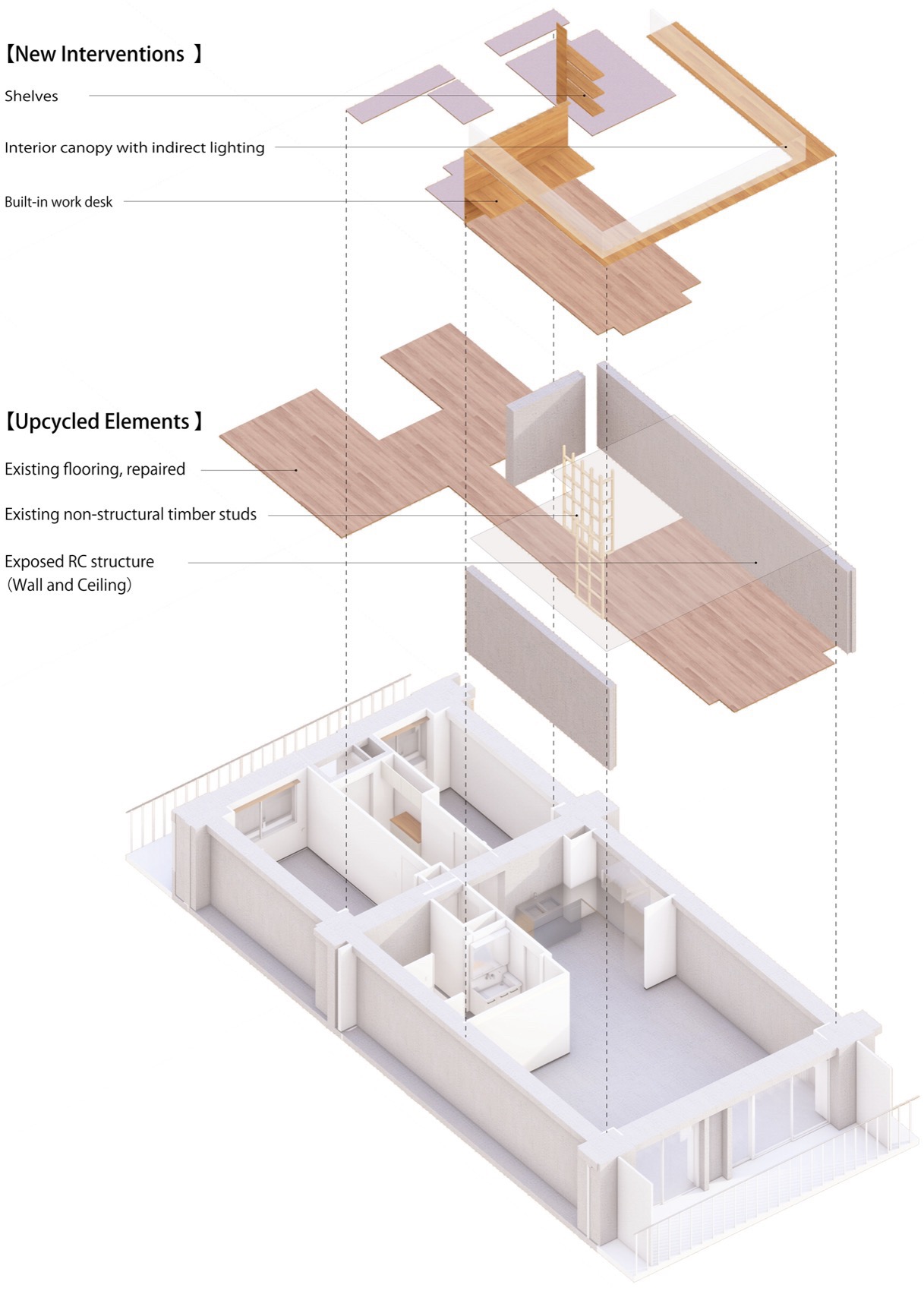 设计并非追求形式的叠加或新奇感,而是通过解读既有平面布局、基层和材料中蕴含的合理性与匿名性展开。本项目摒弃了传统的“全拆除 (Full-skeleton)”式全面更新策略,而是采用三种操作作为一种“升级改造 (Upcycling)”,赋予既有元素新的意义: