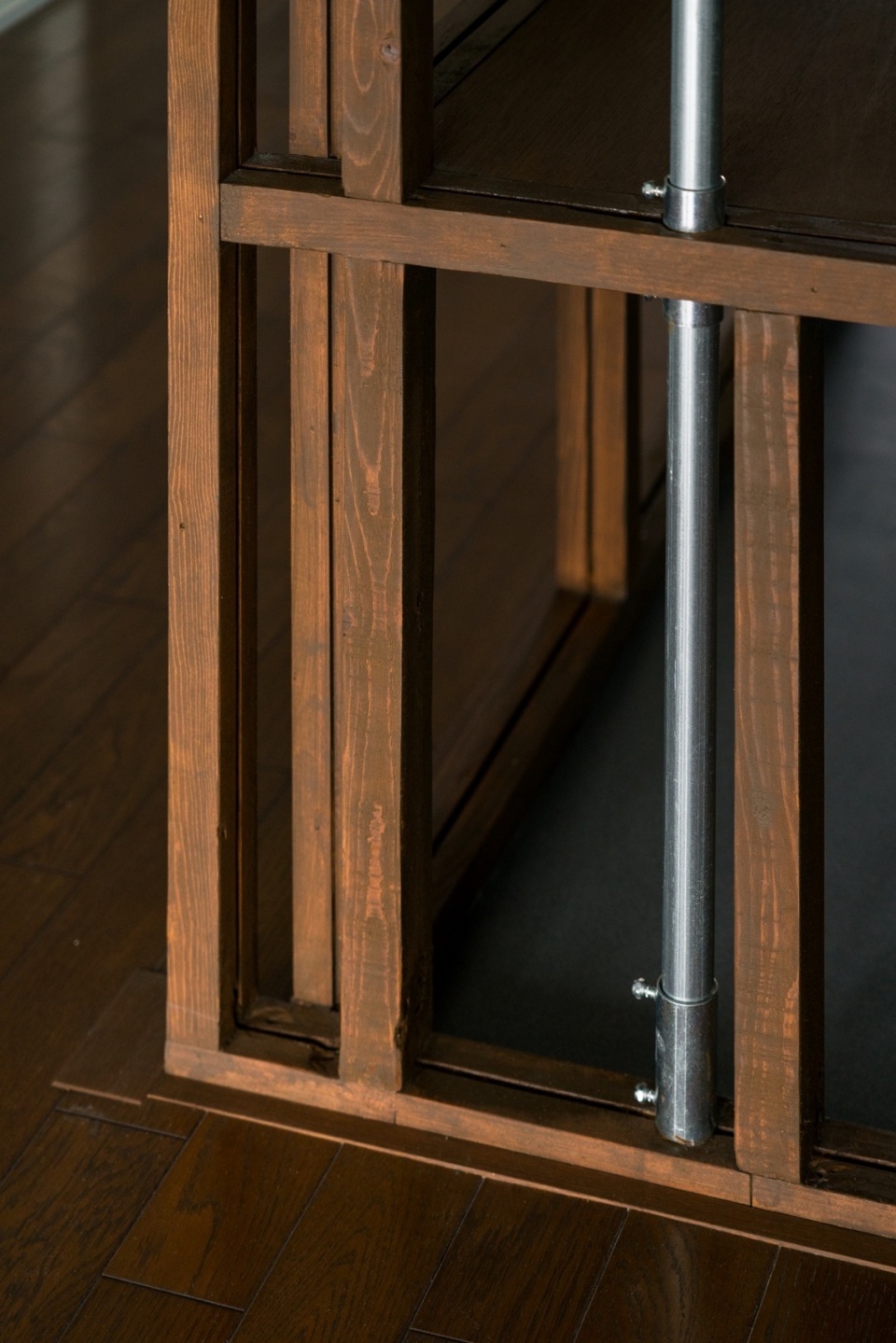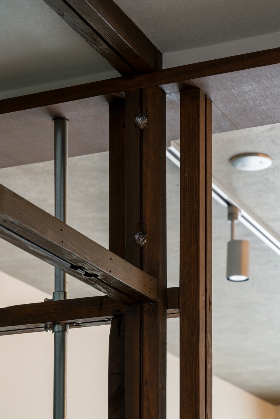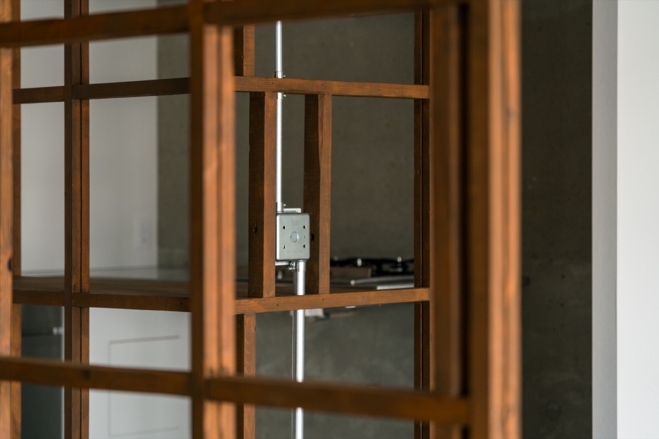 1.Manifestation of Studs The gypsum boards were removed to reveal the wooden studs, which were retained as the spatial framework. Unlike the Light Gauge Steel (LGS) common after the 1990s, the wooden studs of this era are solid structural members adhering to the traditional Shaku-kan-ho module (303mm or 455mm). By liberating them from their hidden role, they were transformed into devices supporting daily functions—serving as mullions for shelves or bases for switches. Their texture as “linear elements” reinterprets traditional Japanese spatial boundaries—such as shoji and lattices—within a modern context.