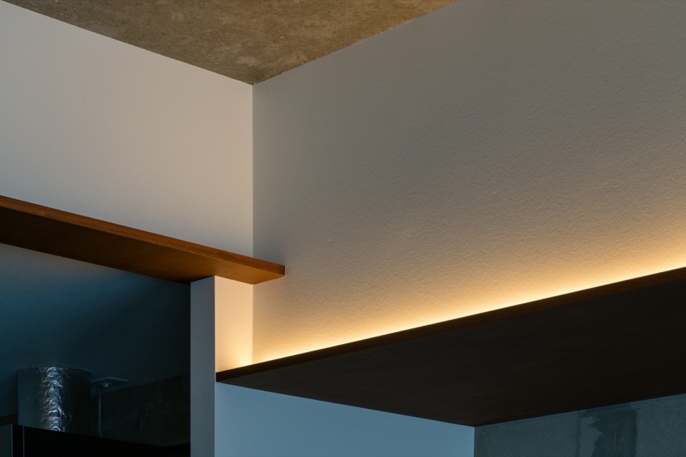 ⅲ)对框架结构的响应 (Response to the Rigid Frame Structure) 老旧公寓中因结构系统和管道路径而产生的大型露梁,传统上一直被视为沉重的障碍物。本项目在梁下安装了“内檐 (Internal eaves)”,并结合间接照明,将其重新定义为同时照亮梁体和天花板的设备。由此,结构限制被转化为赋予空间视觉深度的元素。