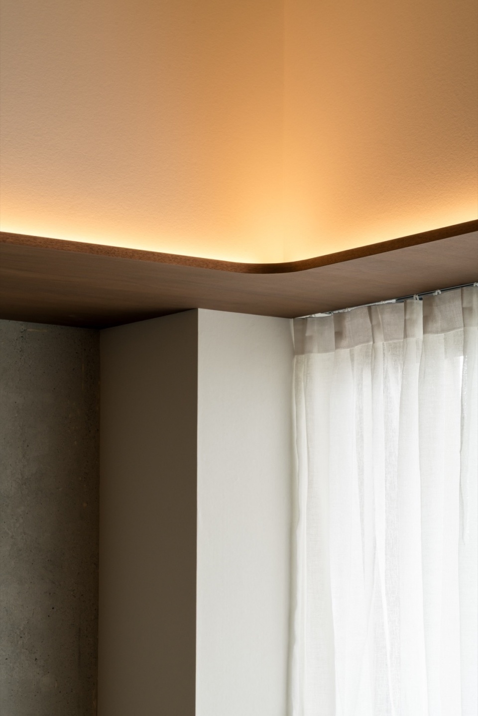 3.Response to the Rigid Frame Structure The large, exposed beams typical of older condominiums have traditionally been seen as oppressive obstacles. This plan installs “internal eaves” beneath the beams, integrating indirect lighting to redefine them as elements that provide visual depth. Structural constraints are thus transformed into atmospheric devices.