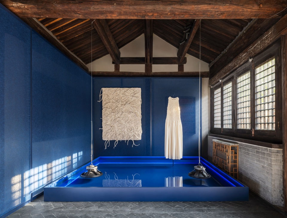 侧面一间厢房被扎染技艺启发,水池和墙面均被打造成了靛蓝色,还原扎染工艺的制作氛围,扎染的精髓融入环境之中。SKYnoa 设计的声音与纺织装置悬吊在染缸水面之上,缠绕曲折的纤维织造有如声音的波形,无声揭示了传统工艺中蕴含的历史,与墙上林芳璐的灵感手稿和介绍共同开启了这趟感官旅程。