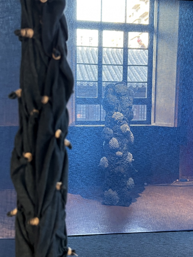 Further into the courtyard is a quiet yet social space. Hanging from the beams is a large fabric piece inspired by Fanglu Lin’s work, blending handcraft with the building. The space becomes a walk-in art installation – an extension of the collection and a visual centerpiece. It draws viewers into textile art while offering a great photo spot.