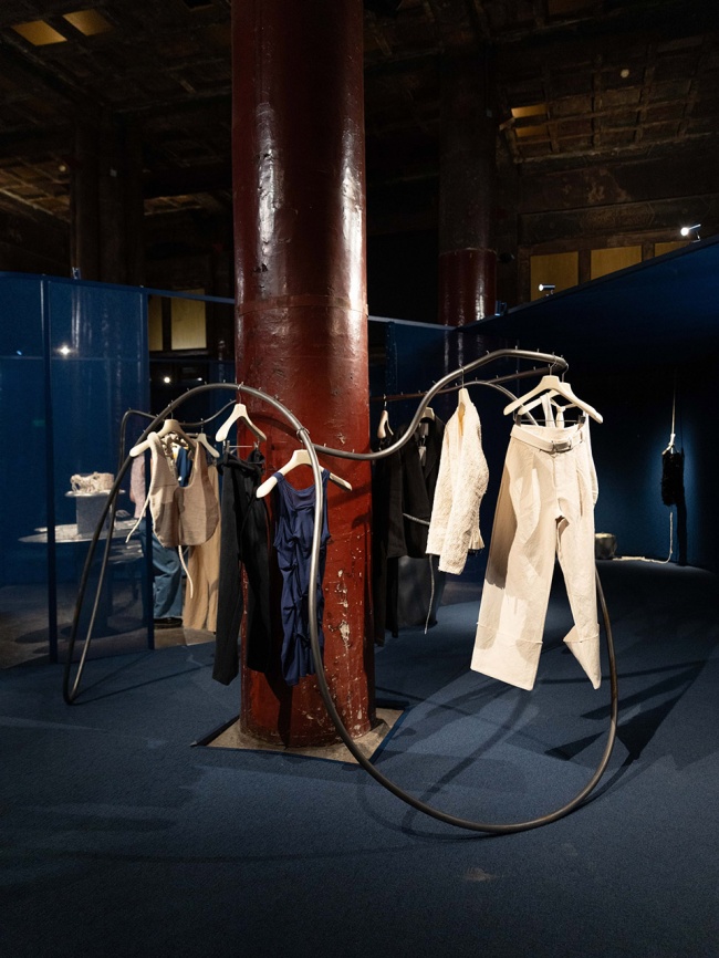 设计师凭借看似简单的织物改变了建筑、空间和人的关系,打造出不动声色的故事氛围,供人穿越、回望、驻足。寺庙仍在,但被柔化为更为温和的背景。织物墙宛如画布,不仅承托着空间氛围,也成为展示系列关键作品的舞台。家具设计以传统材质为灵感,呈现全新形态。衣架以有机形态流动,柔化空间的几何结构。桌子由手工工艺铸造,融合混凝土与布料纹理,呼应材质之美,也强化对手工技艺的致敬。