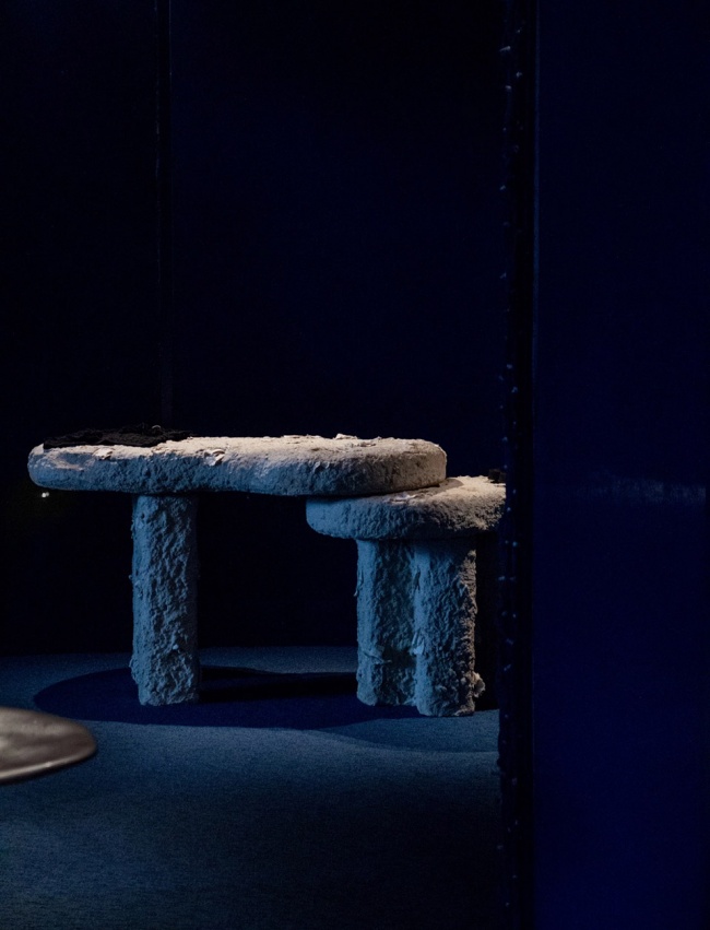A side wing of the temple is transformed into a dyeing studio inspired by tie-dye techniques. Pools and walls are washed in indigo, recreating the ambience of a traditional workshop. Suspended above the dye vats is an audio-textile installation designed by SKYnoa, their twisted fibers resemble sound waves, silently revealing the hidden history of craftsmanship. On the surrounding walls, Fanglu Lin’s sketches and process notes invite visitors to embark on a sensory journey.