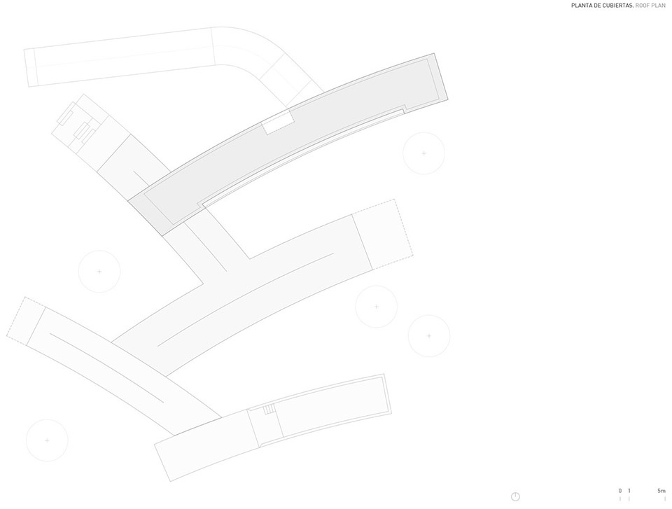 The project combines two ancestral archetypes: the pavilion, understood as an open and centrifugal space; and the courtyard, conceived as a more sheltered yet open-air domain. We have always been fascinated by the relationship with the exterior in some elongated-plan projects by Glenn Murcutt and Stephane Beel, among others. The pieces are configured as longitudinal, through-running elements, obtained by means of a large-radius curve. These bodies are juxtaposed to optimise circulation. From this interplay emerge five gardens with their own identities —almost open courtyards— defined by the disposition of the architecture. Each offers a particular atmosphere and multiplies visual relationships, ensuring that the exterior is always an active presence in the experience of the whole. They are spaces prepared to host the large-scale plant species that will arrive over time.