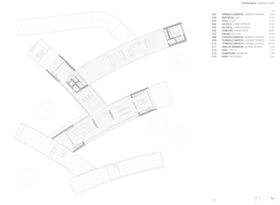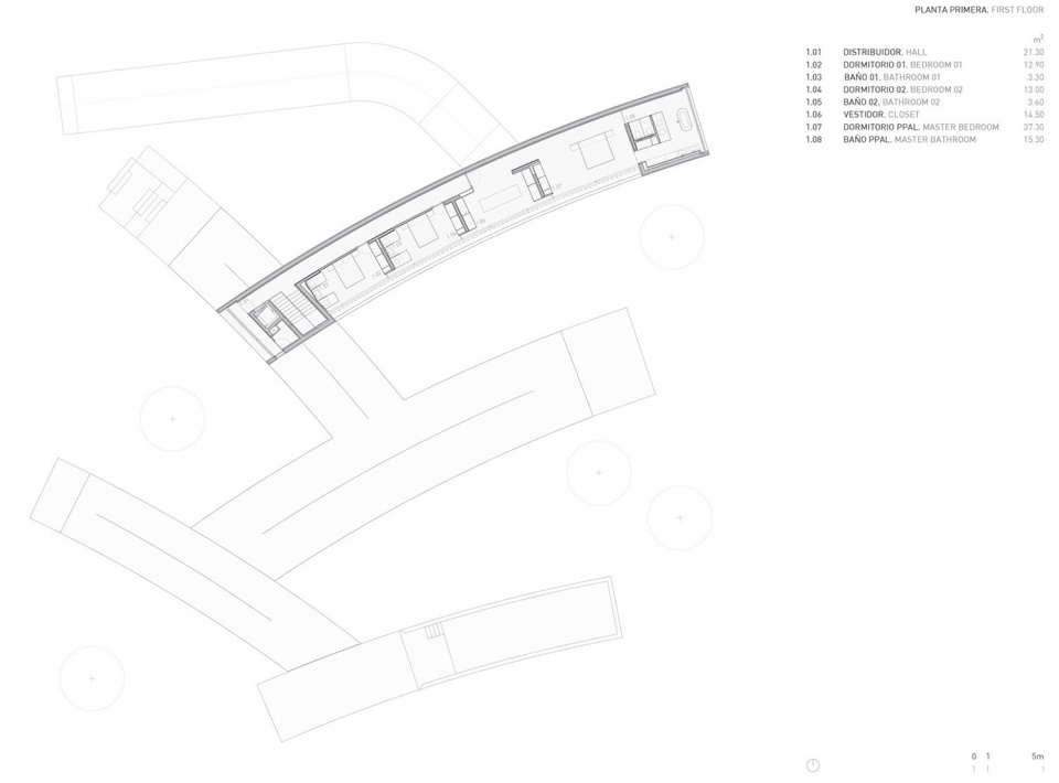 本项目提出了一种与花园深度交织的建筑策略,通过最大化建筑与景观的接触界面,消解建成空间与自然之间的边界。在马德里拉·莫拉莱哈这一语境中,这种对环境关系的强调尤为重要。设计刻意摒弃紧凑的体量形式,转而采用向上延展的布局结构,呼应阿尔法罗(Alfaro)部分作品中所呈现的空间姿态。项目试图调和一种看似对立的特质:几何的精确性与有机的自然感。其构造虽严谨克制,却在感知层面呈现出一种仿佛自然生长、偶然落位的状态。